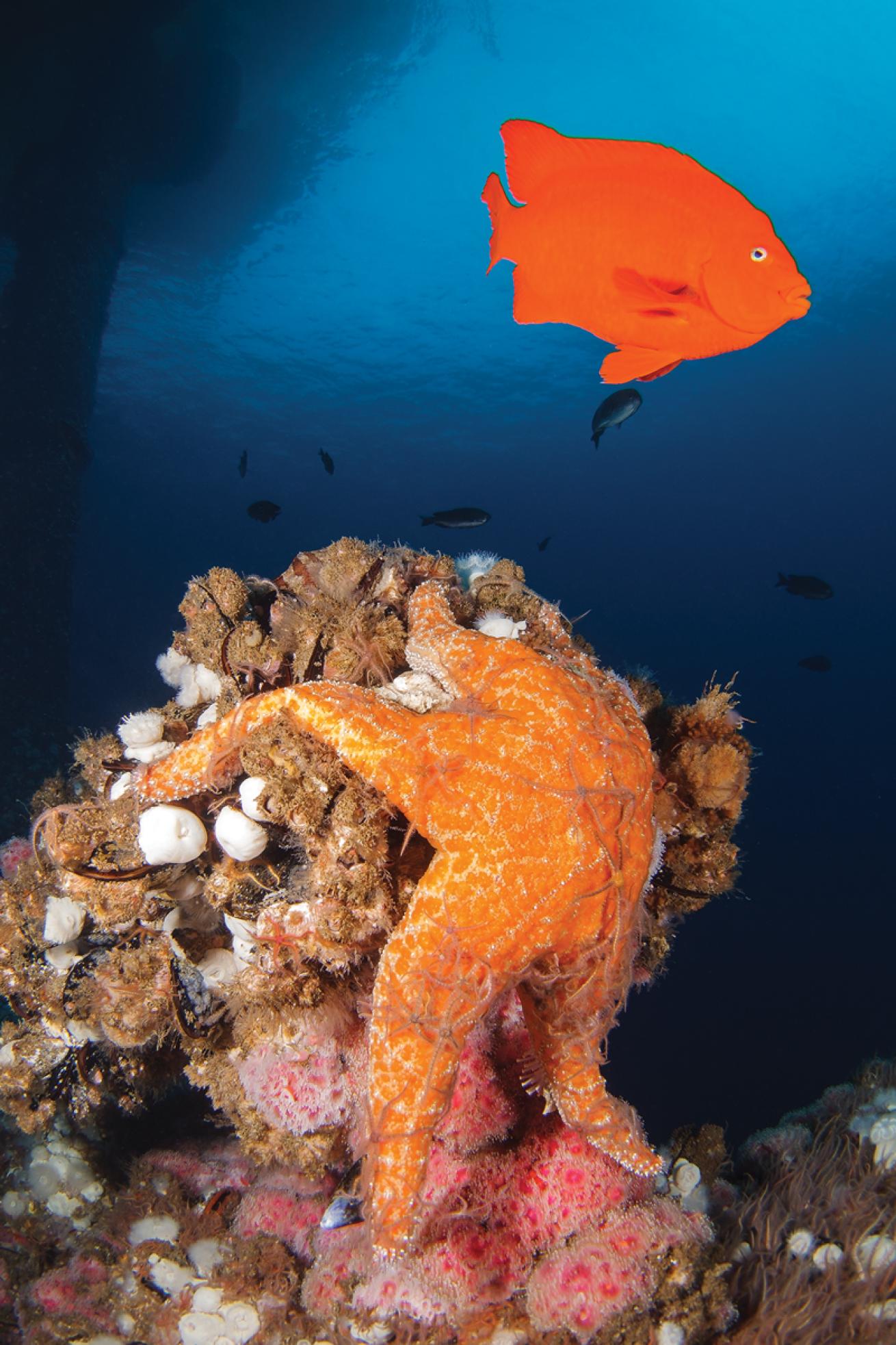 The fish at these depths add to the kaleidoscope. Brightly speckled rockfishes and greenlings watch cautiously from the crossbeams. A plum-colored California scorpionfish attempts to remain incognito on a girder, despite the determined harassment of several crimson sheepheads. An orange garibaldi charges us angrily, guarding his nest. It’s a feast for photographers, and we happily partake.