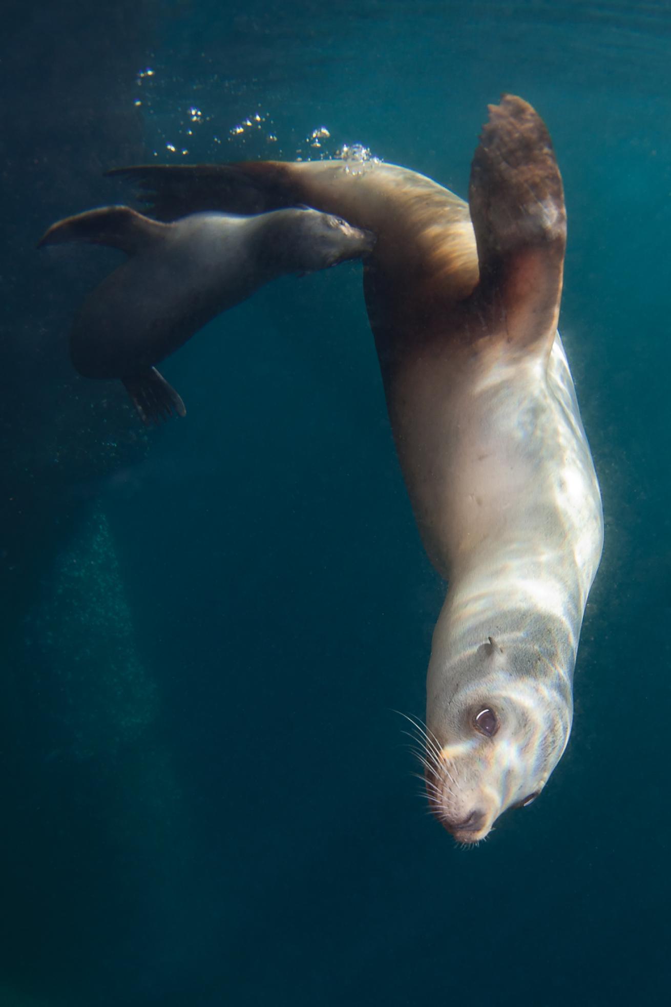 With her silvery coat, she’s lighter than most of the other sea lions in her small group. As I observe her closely, I realize she’s being tailed by a tiny pup that is trying to nurse. The rest of my stop passes quickly as I photograph the rare poignant scene. Eventually the sea lion swims away, and I surface, euphoric, and signal to the boat. As I am climbing on board, I hear shouts from the divers on board.