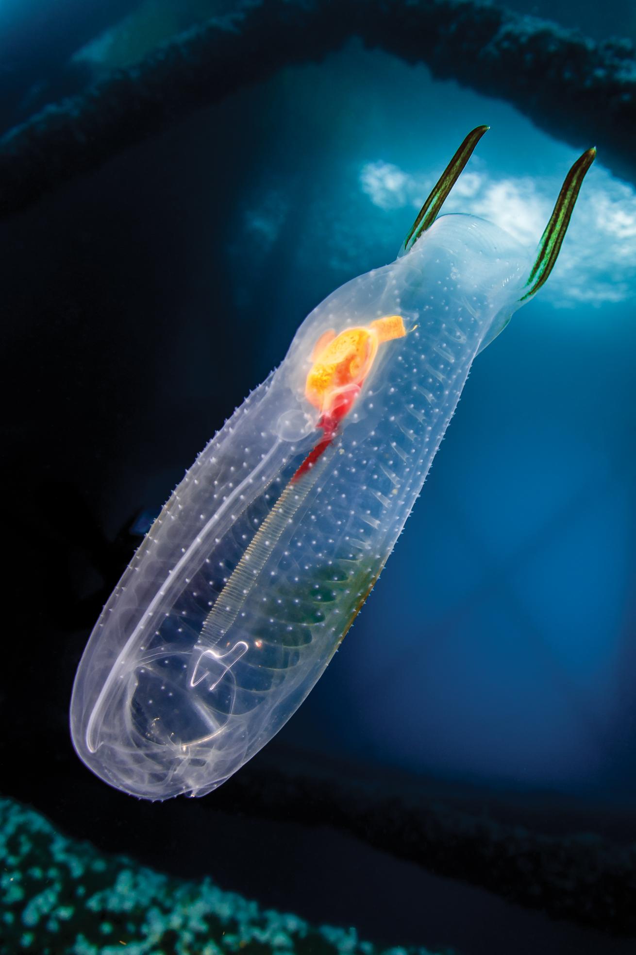 We continue our ascent through a swirl of silvery baitfish, watching as the scenery changes once again. At depths of less than 40 feet, the girders are encrusted with glossy black mussels and small white colonial anemones, less remarkable than the technicolor array encasing the deeper structures. Frankly, I find the backdrop more exciting, since the shallow water here in the open ocean is often filled with a parade of glowing pelagic invertebrates. Salp chains, graceful sea butterflies, and pulsing comb jellies: What better way to pass a safety stop?