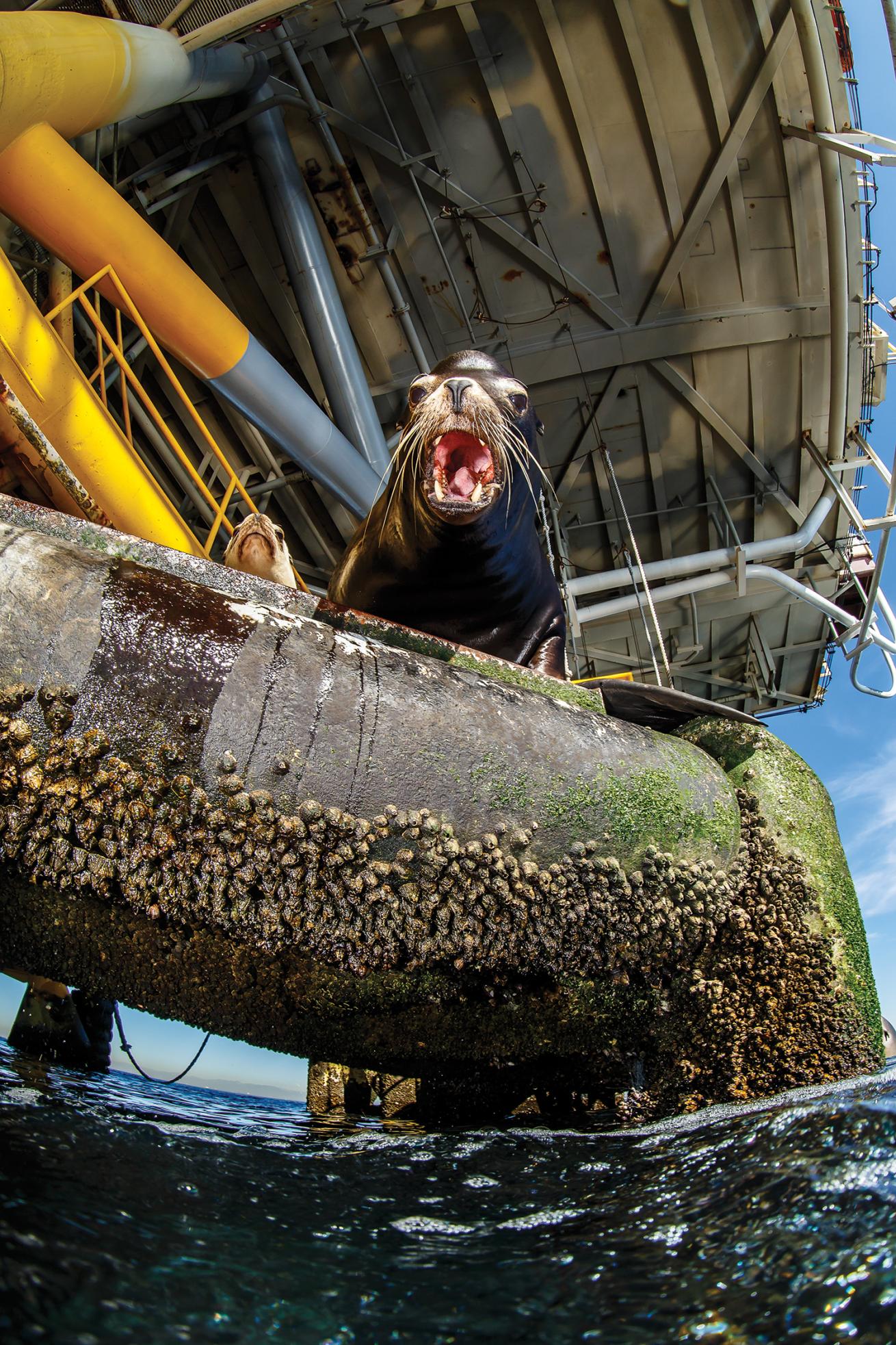 A sea lion aboard one of the oil rigs disapproves of intruding divers.