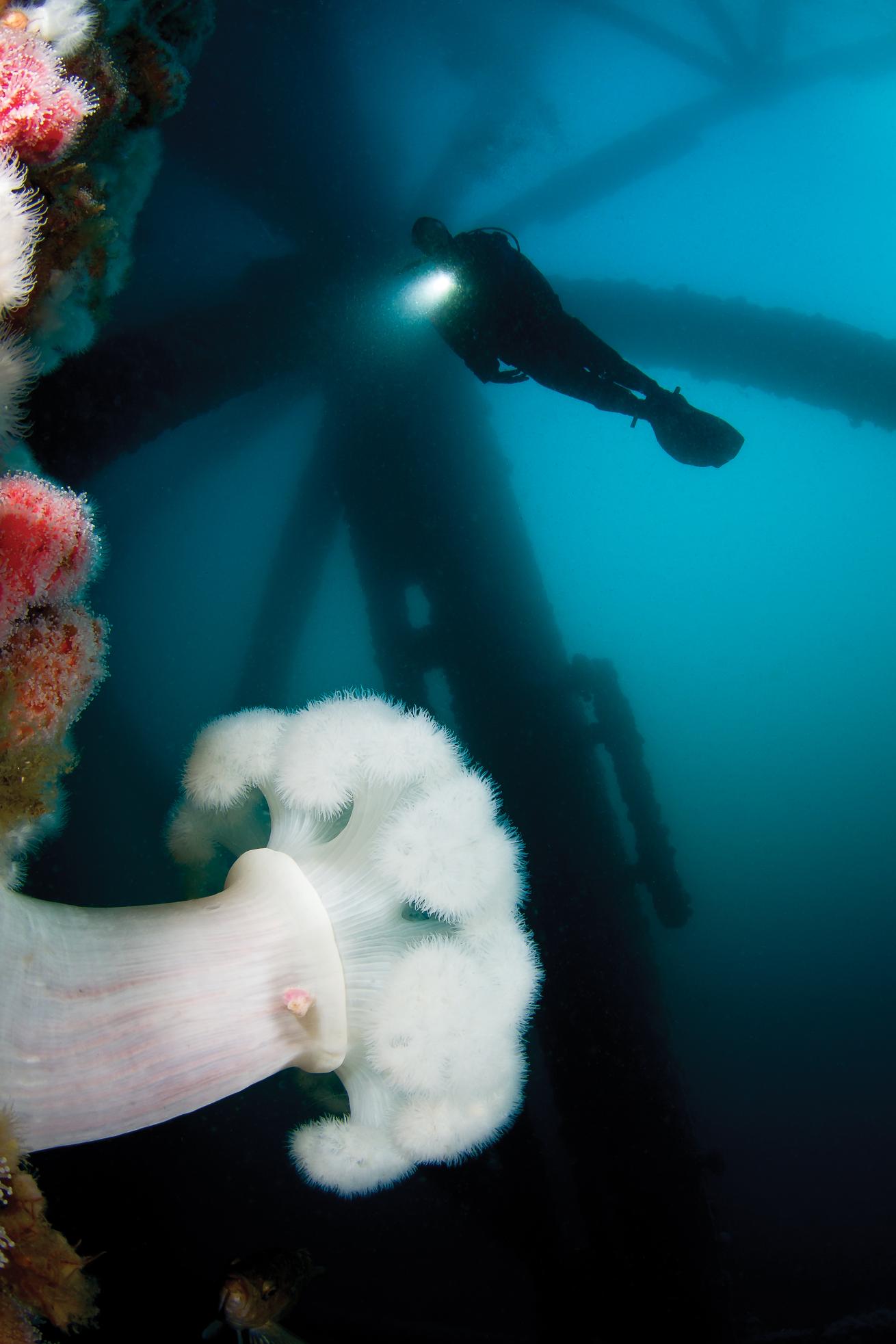 Giant metridium are plentiful on the deep structures of the oil platforms. These sea anemones are found mainly in the cool waters of the northern Pacific and Atlantic oceans.