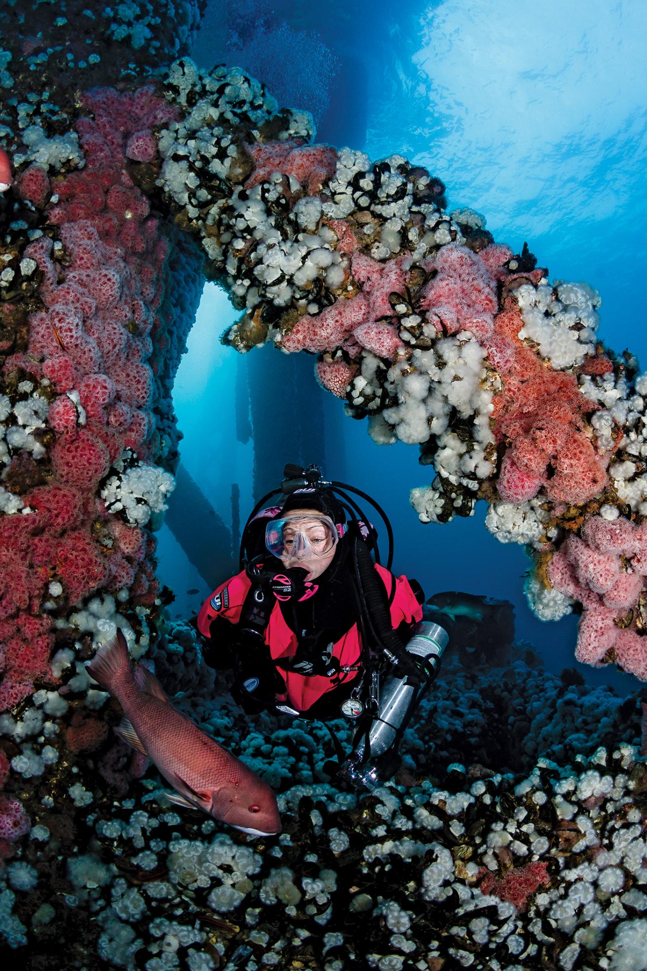 The boat pulls close to the huge structure, disturbing the sea lions draped lazily across the moorings and inciting a cacophony of barking protest. We’ve arrived at the Eureka oil platform, our favorite of the three diveable rigs near Long Beach. The captain shifts the boat into neutral as the divemaster calls out, “Ready? Dive!” Pairs of divers oblige, and soon it’s my turn on the swim step. As I enter the water, the butterflies in my stomach have returned. It’s a familiar sensation. Despite the hundreds of hours I’ve spent underwater here, descending under the platform still spooks me. Since the huge surface structure blocks out much of the ambient light, it takes my eyes a minute to adjust to the dark water. The lattice of giant steel beams extends into the depths, beyond my sight and far beyond recreational limits, crossing horizontally at 60-foot intervals to create a beckoning series of levels. The noise of these working structures adds to the eerie ambience, as thundering resupply boats arrive and hisses accompany bursts of bubbles that periodically emerge from the depths. I pass a thermocline that drops the temperature 8 chilly degrees as the current abruptly shifts and speeds up. I watch my gauges vigilantly. When we reach our maximum depth of 140 feet, my buddy and I level off and flash each other eager “OK” signs (his more eager than mine).