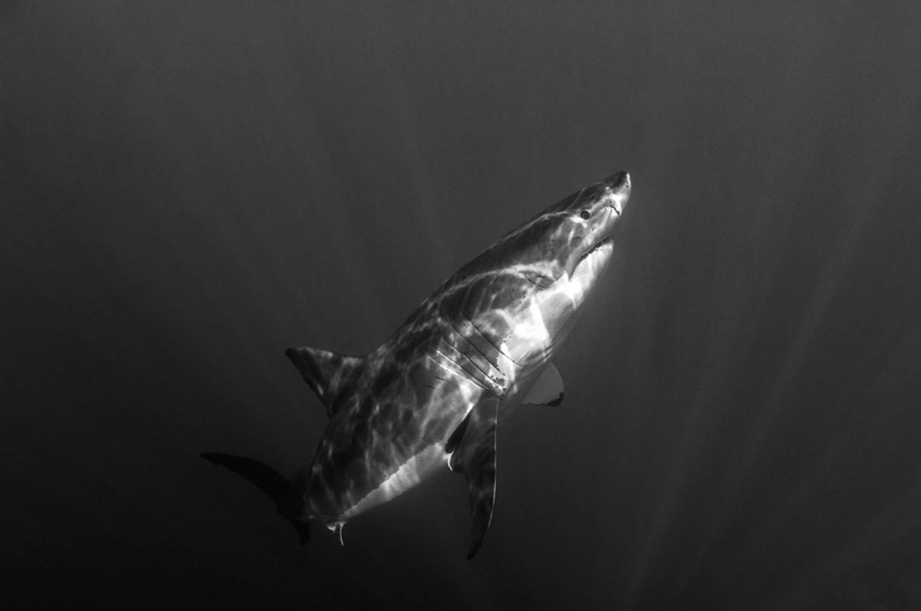 This photo was taken as the great white shark was surfacing and backlit by beautiful sun rays. The photographer was out of the cage.