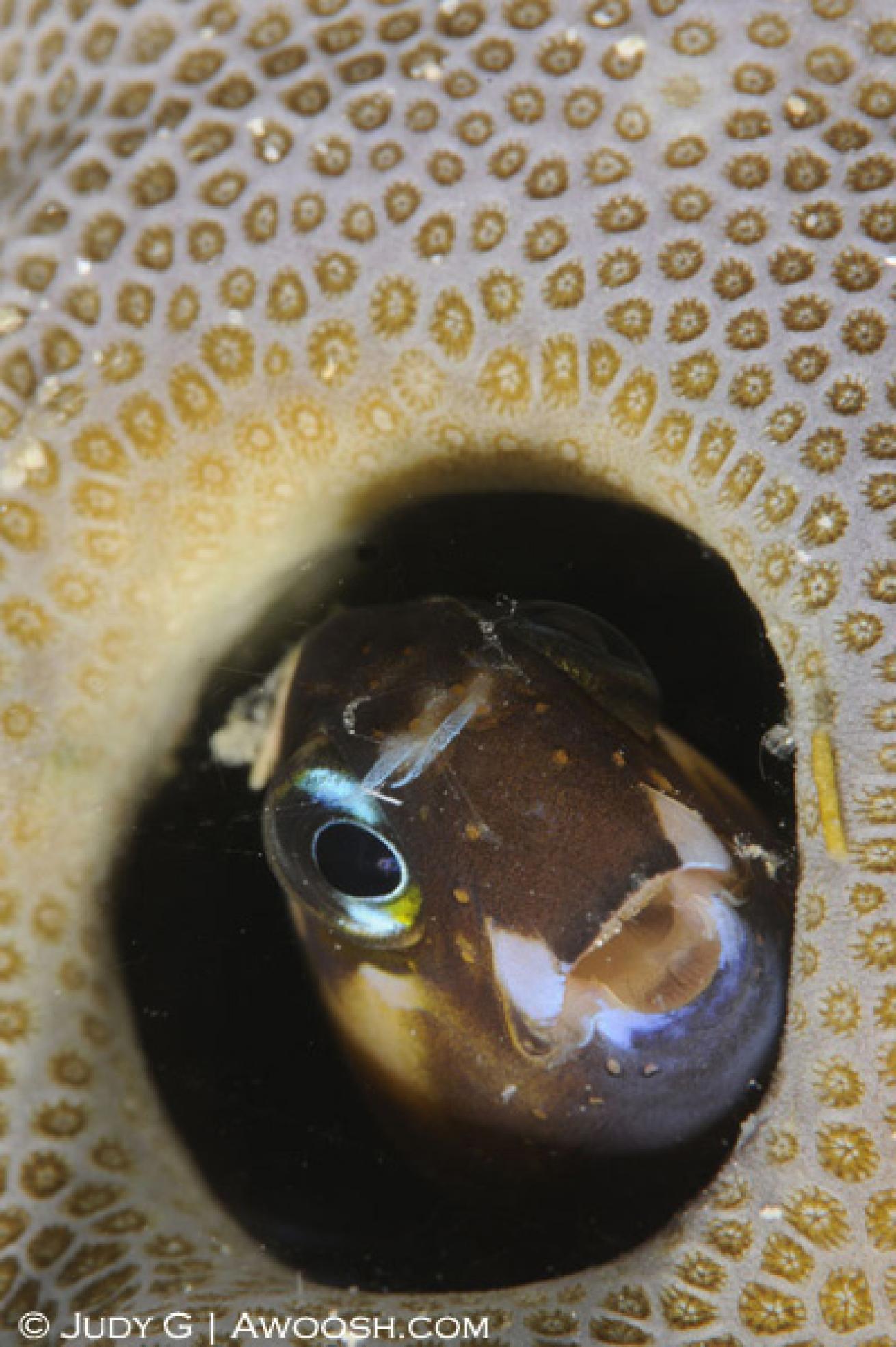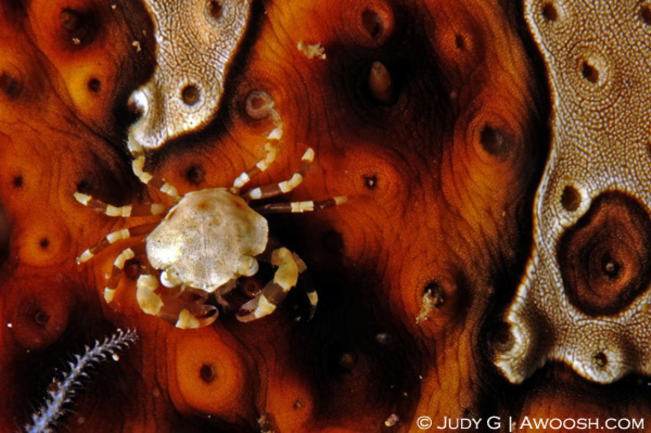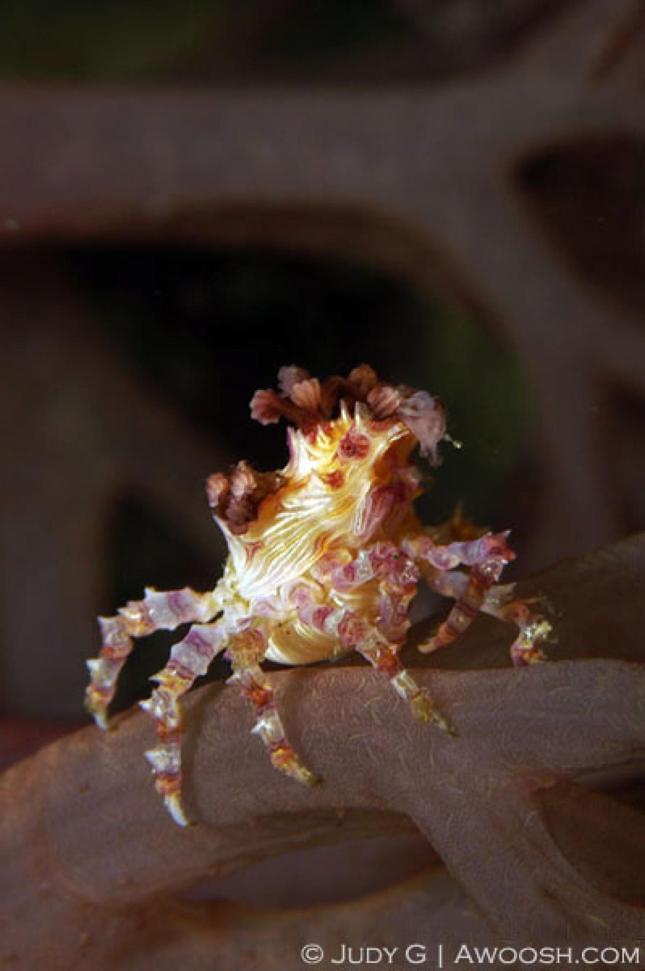 As its name suggests, coral hermit crabs live in corals — most often boulder types. Almost impossible for me to see with my lousy eyes, I look for a bit of motion (as they deploy their feather-like appendages to sweep the water for plankton), and then focus in with the macro lens to really see them.