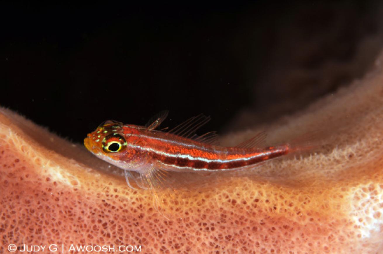 These common little fish can be confounding to photograph as they are quite skittish. This little guy is perched on a pretty pink sponge.