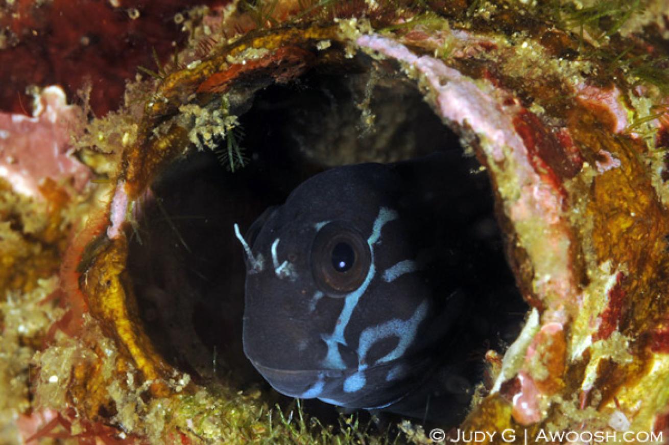 I haven’t been able to make a positive identification for this blue-faced blennie. Its head was about half an inch in diameter. I captured this image in Komodo, Indonesia, at Cannibal Rock. Blennies typically have cute little faces and can be fun (and frustrating because they retreat into their holes!) to photograph. Having a close look at little indents and holes in coral heads or in the rocks can be rewarded with finding neat little fish like these.