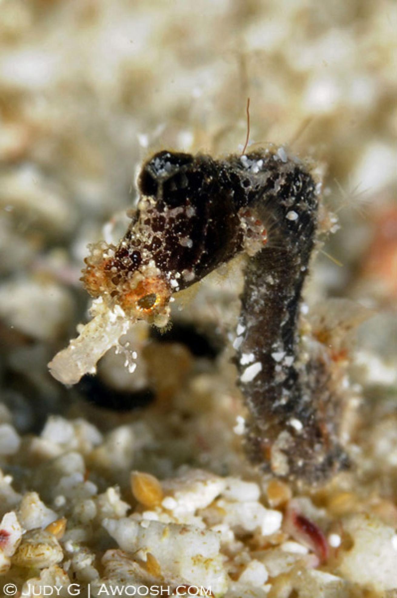 This tiny little character, which I believe is a variety of pygmy pipehorse, was photographed in Fiji. To my bare eye, it looked like a bit of string waving in the current. I was thrilled to have a look through my macro lens and see such detail.