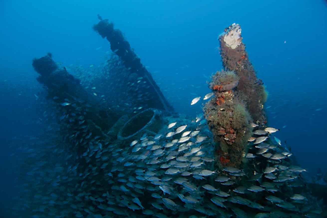 The captured World War I gunship, the USS Schurz, is a classic North Carolina wreck dive. The 255-foot ship was sunk June 21, 1918, 30 nautical miles south of Beaufort Inlet, after colliding with the SS Florida while sailing at night. When discovered in the 1980s, it was popular for those seeking to reclaim artifacts and take home a piece of history. Brass portholes, crew personal effects and weapons were some of the many items removed. Today, it is illegal to take artifacts from the Schurz, and most are content to see the beautiful reef system this wreck site has become. Colorful sea fans, dense schools of baitfish and the occasional shark keep divers returning year after year.