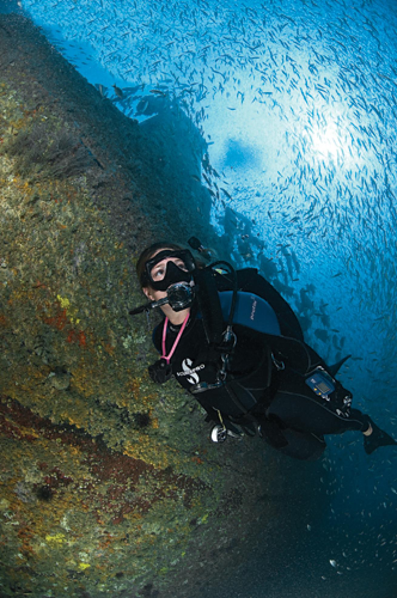 The Spar offers wreck-loving scuba divers lots of external features to explore, including a crane, an intact propeller and rudder and more. The prolific marine life that populates the wreck, like this school of Atlantic spadefish, share the attraction.