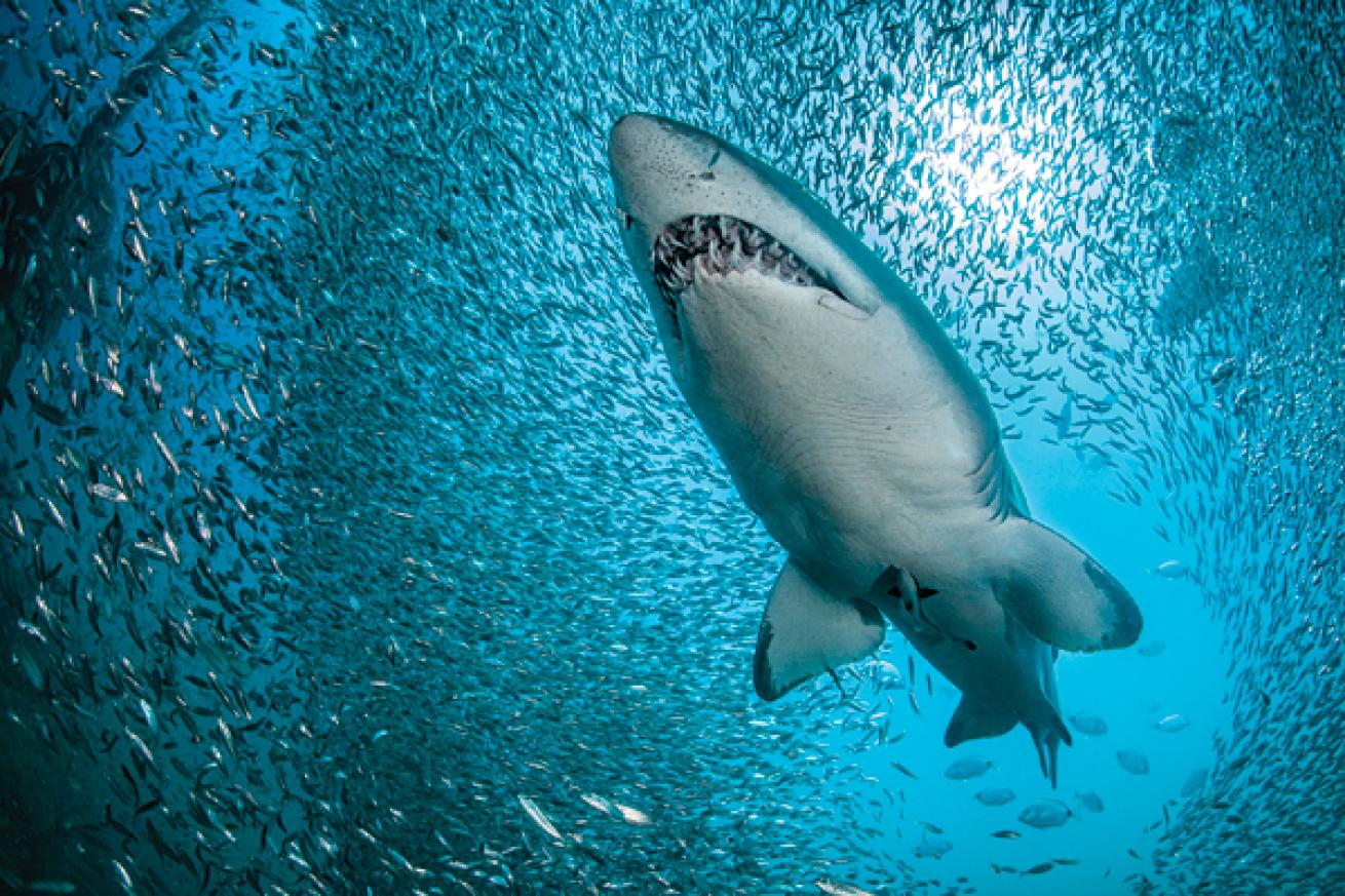 Hovering in a gentle current, marine life is thick all around the wreck of the Aeolus. Feisty jacks, frantic tunnies and numerous other menacing predators patrol the perimeter of the wreck in pursuit of frenzied baitfish. A crew of hulking barracudas loiters around in midwater like thugs on a street corner, while from a safe distance, countless weary groupers mill about on the bottom trying to make sense of the noisy invader. The spectacle grows only more intense as I discover a dozen or more sand tiger sharks inside the wreck. They show no fear as I approach. With the exception of my camera trigger finger firing off photographs, I remain motionless under the top deck of the wreck while the sharks swim around and around within arms’ reach. One after another, they bump in to my dome port with menacing ragged teeth bared. Even the repetitive bursts from my strobes won’t startle them. The subject matter is perfect, and scoring great images comes easy — just another banner dive day on the Outer Banks.