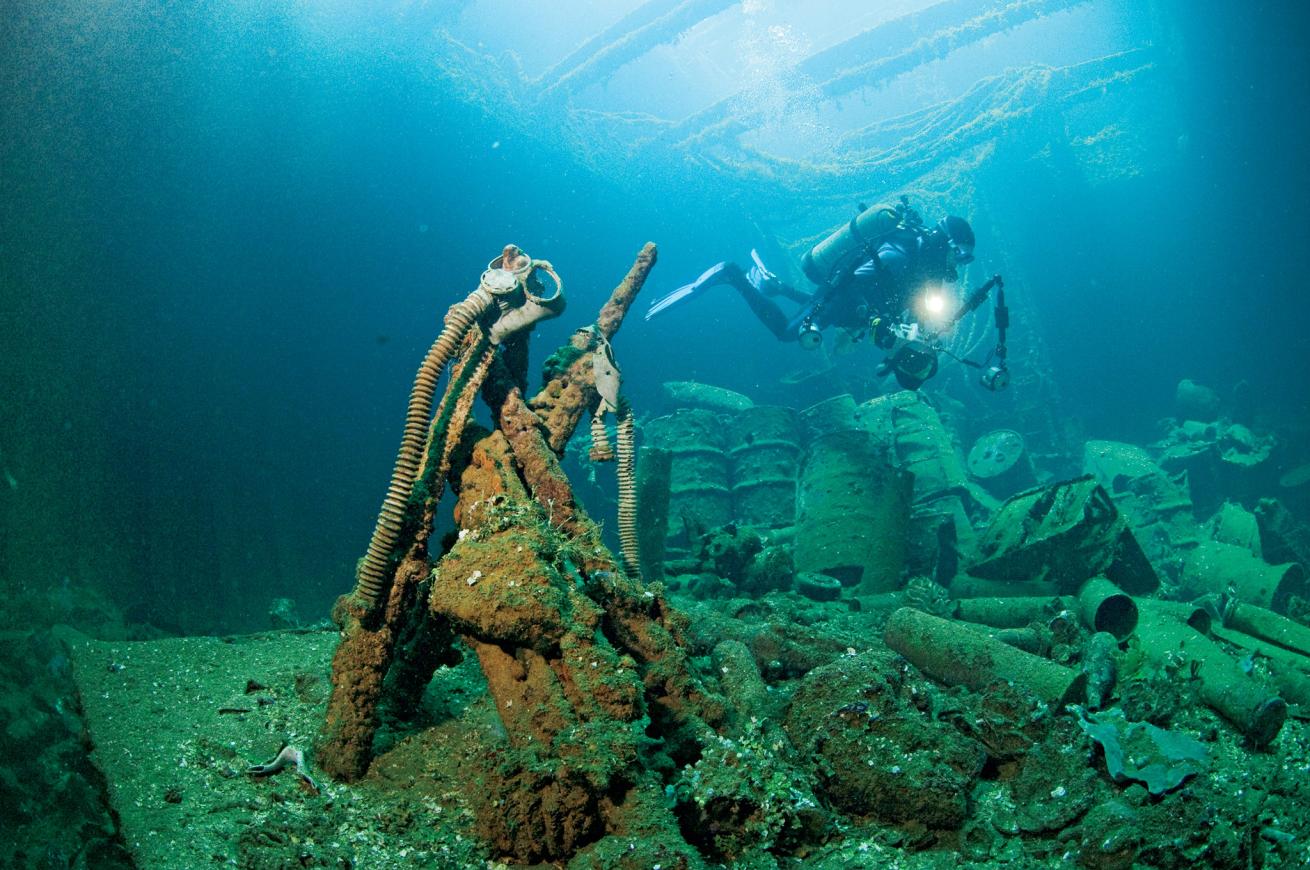 Ethan GordonA diver investigates machine guns, gas masks and oil drums in one of the holds of the Fujikawa Maru, a World War II wreck dive in Truk Lagoon.