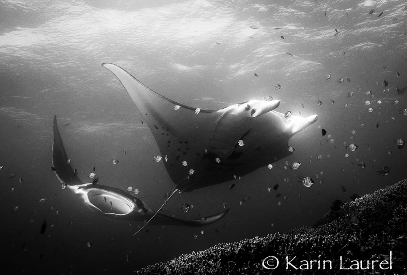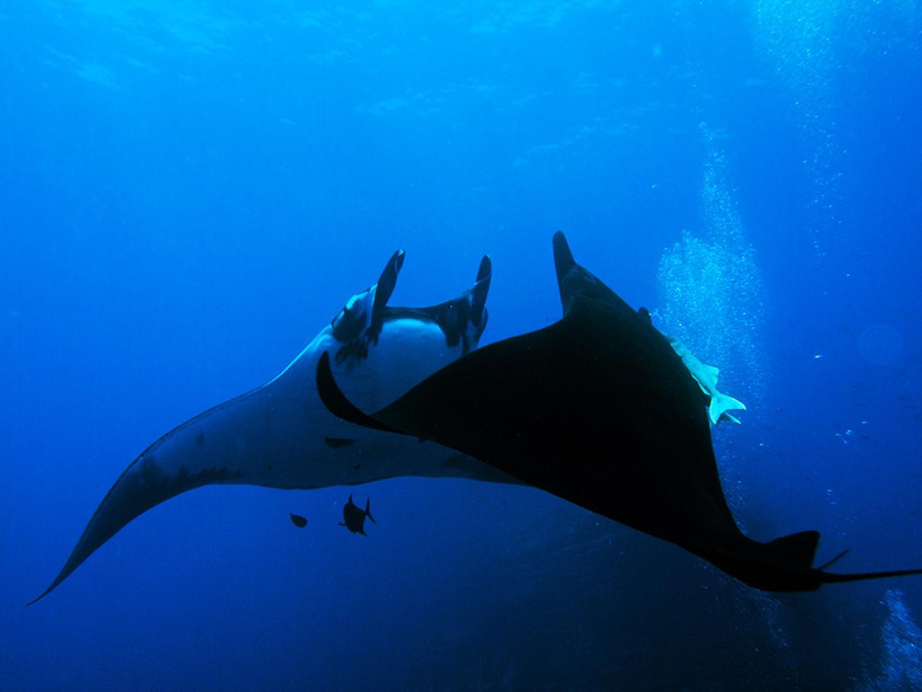 Here, two mantas are interacting playfully with each other. Manta rays have the largest brains of all fish and much remains to be discovered about their intelligence and natural social behavior. Detailed, long-term observations has proven especially difficult since few have ever been held in captivity successfully.
