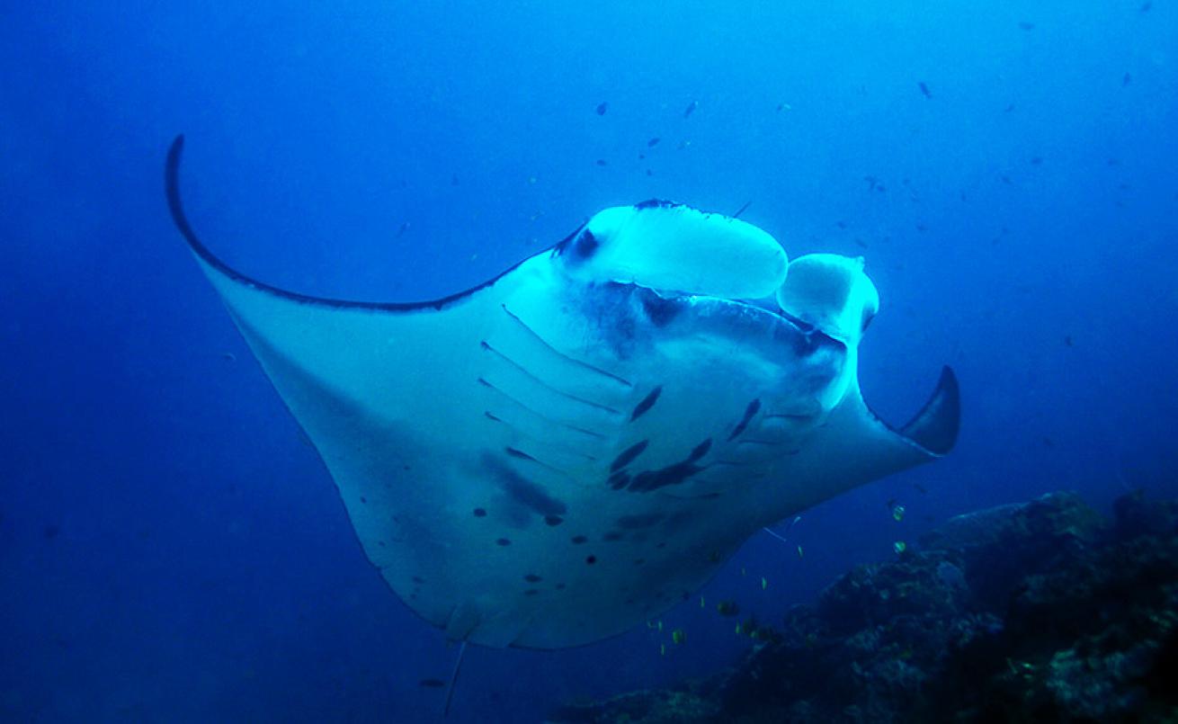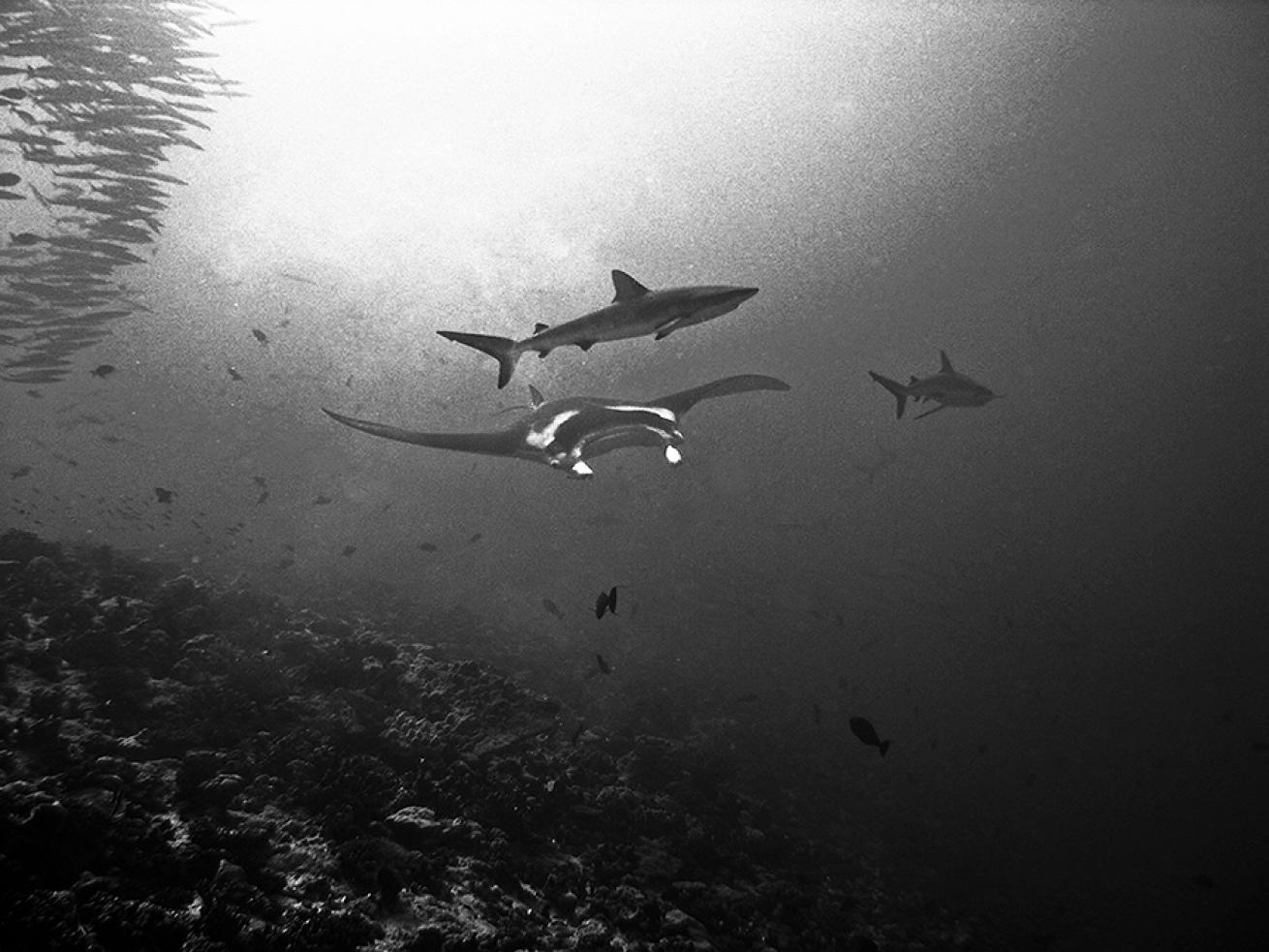 Mantas are a common sight of this isolated atoll. The strong currents bring nutrients and plankton, the nutrients bring the fish, and the fish attract the sharks. Such is the circle of life.
