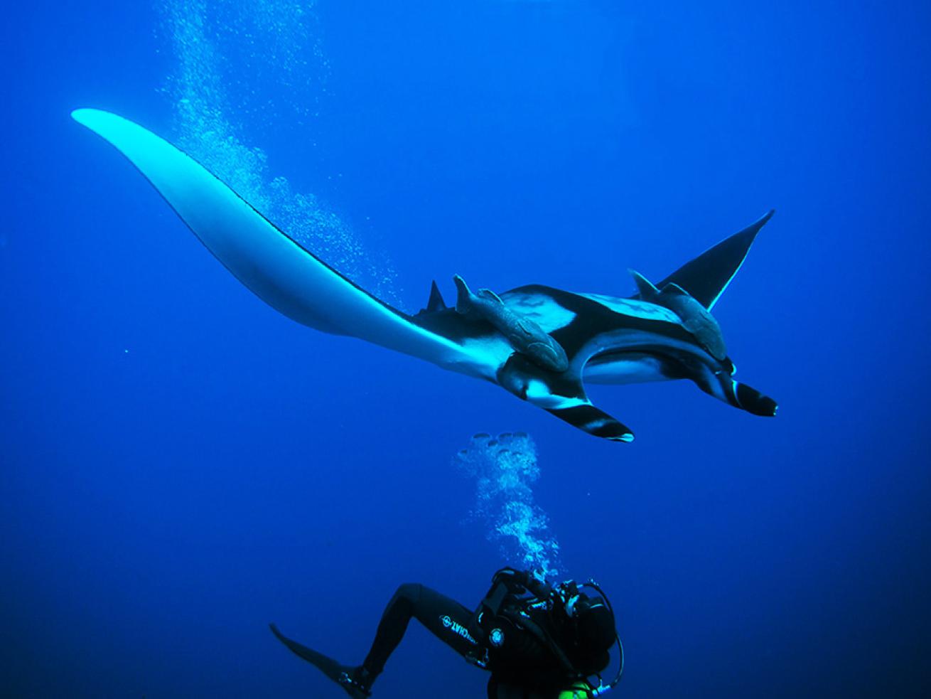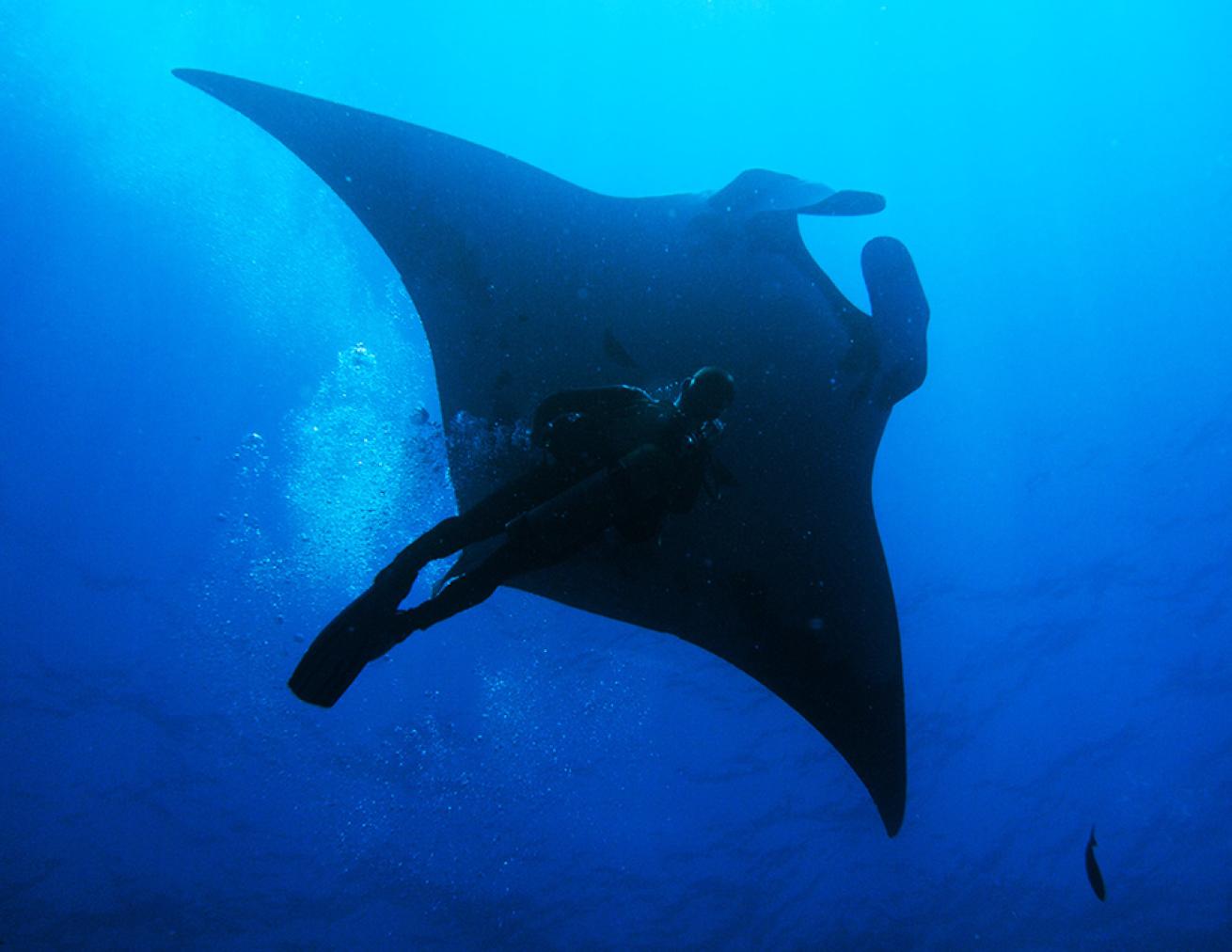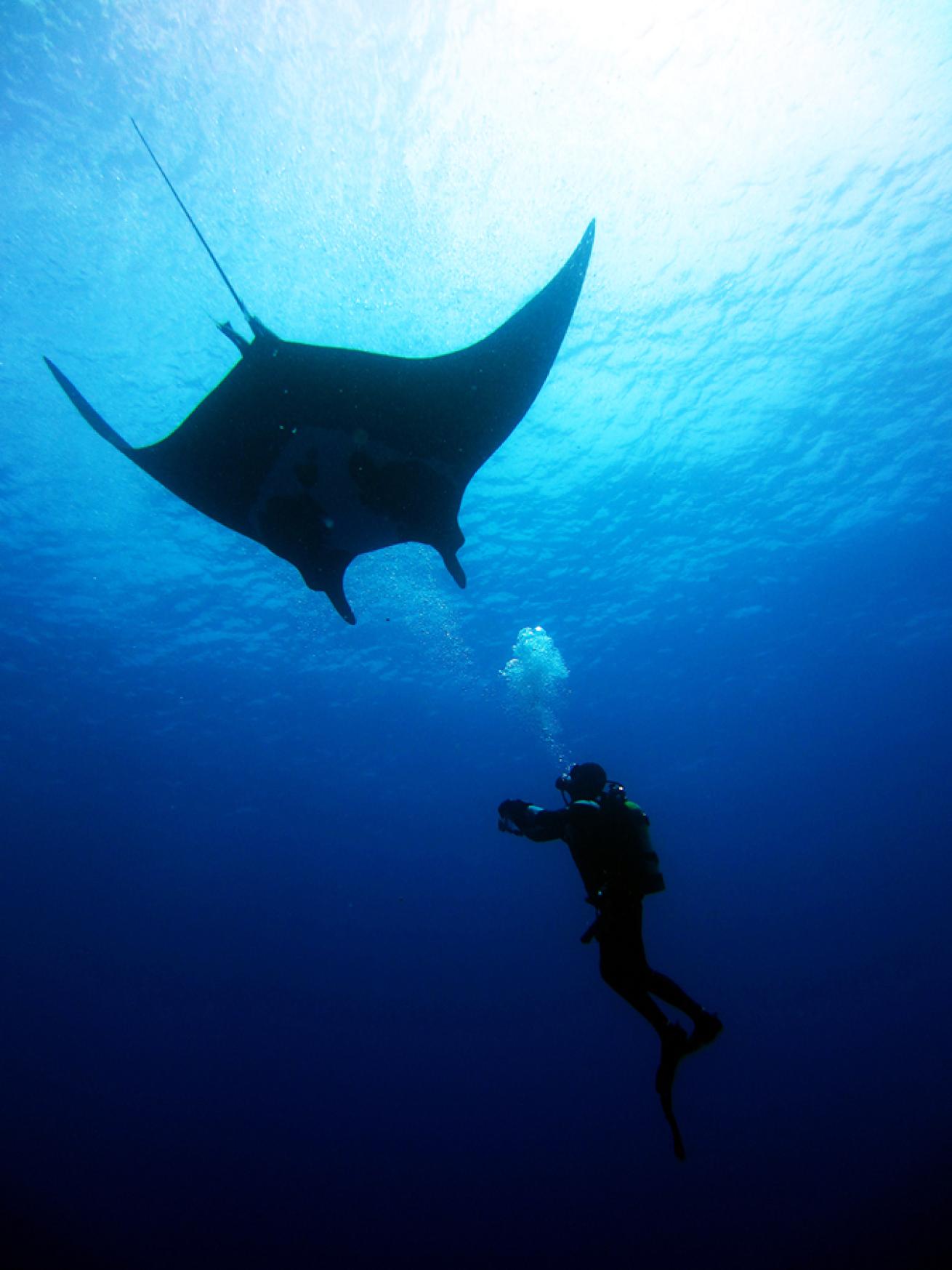 A manta ray seeks out diver bubbles. Manta rays are curious and gentle creatures who enjoy interacting with divers. Unlike stingrays, mantas lack stinging barbs on their long tails.