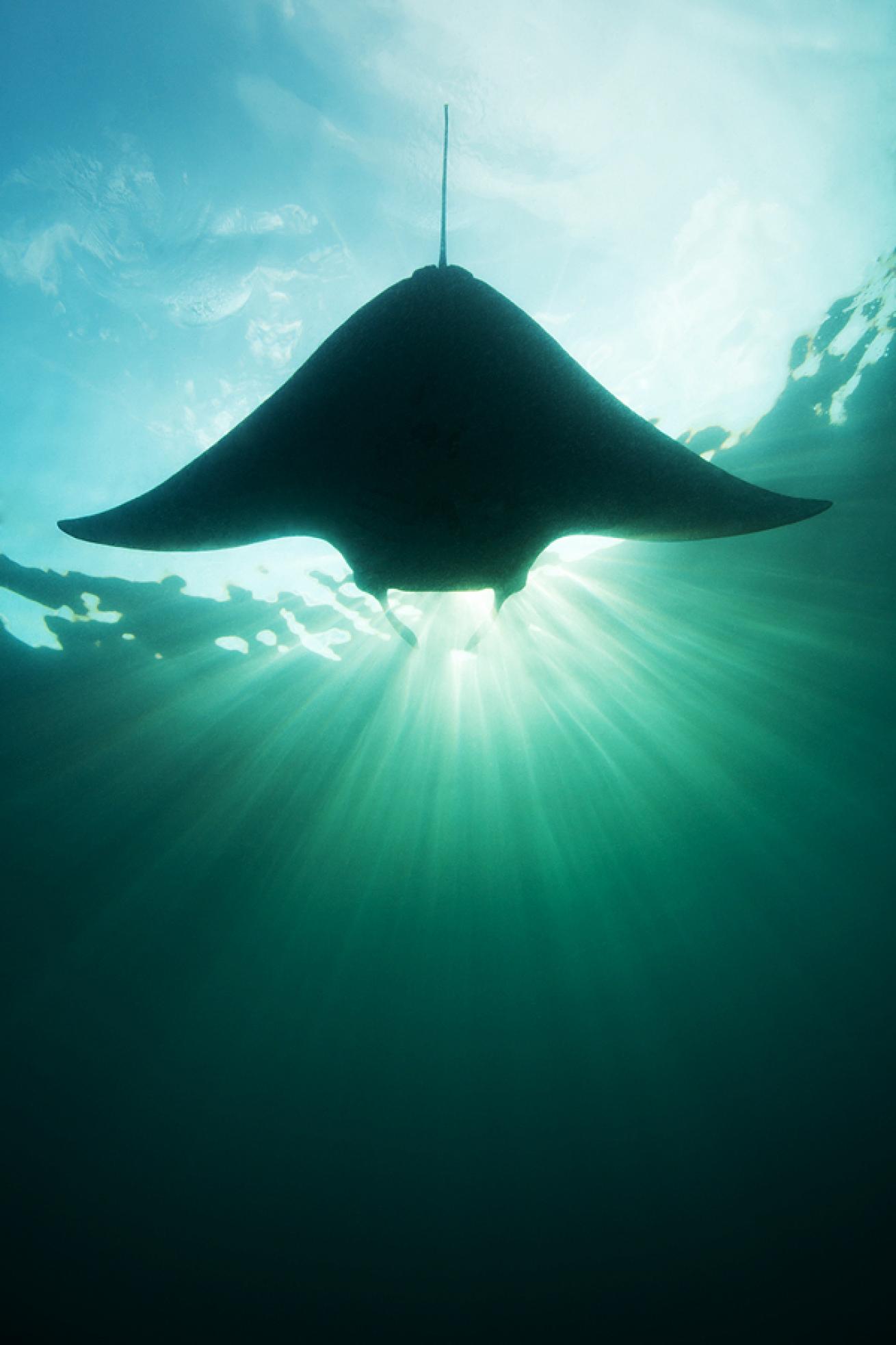 A surreal depiction of soaring spotted eagle rays on the hunt. In their natural environment, eagle rays hunt for clams, oysters, shrimp, octopus, squid and sea urchins, as well as small bony fishes.