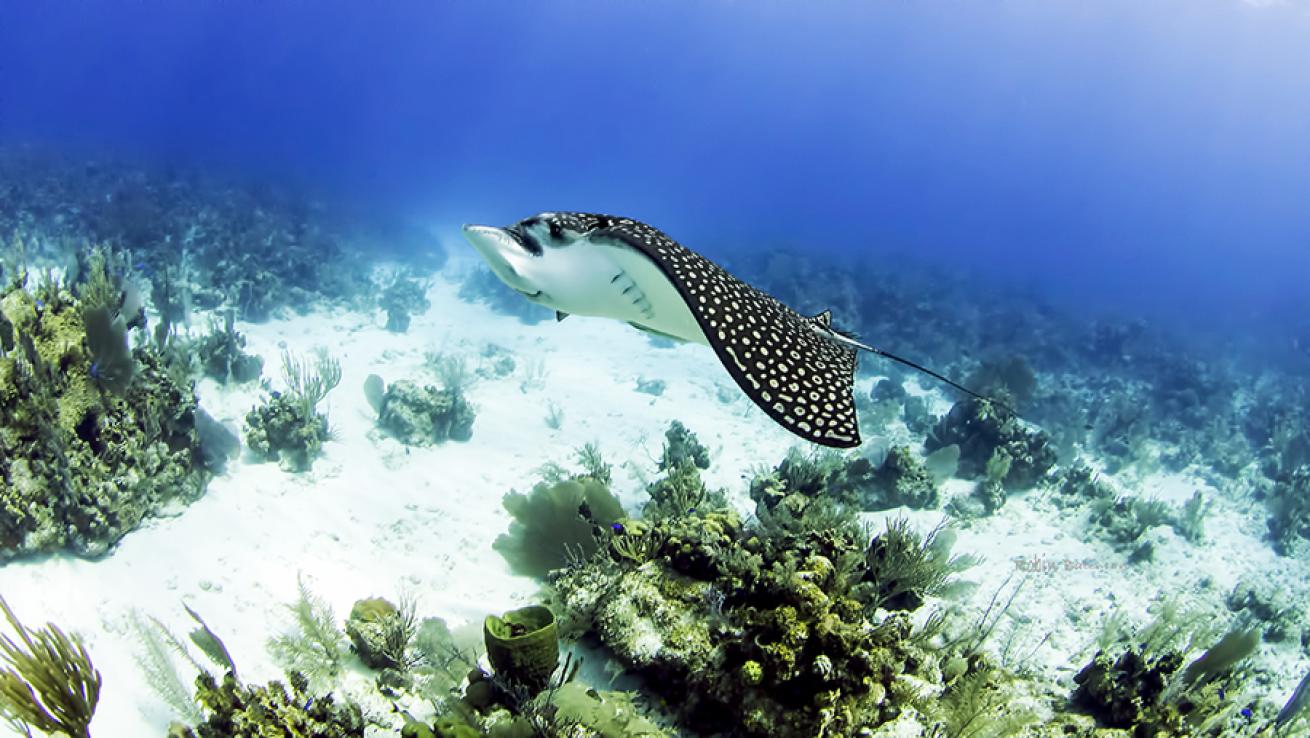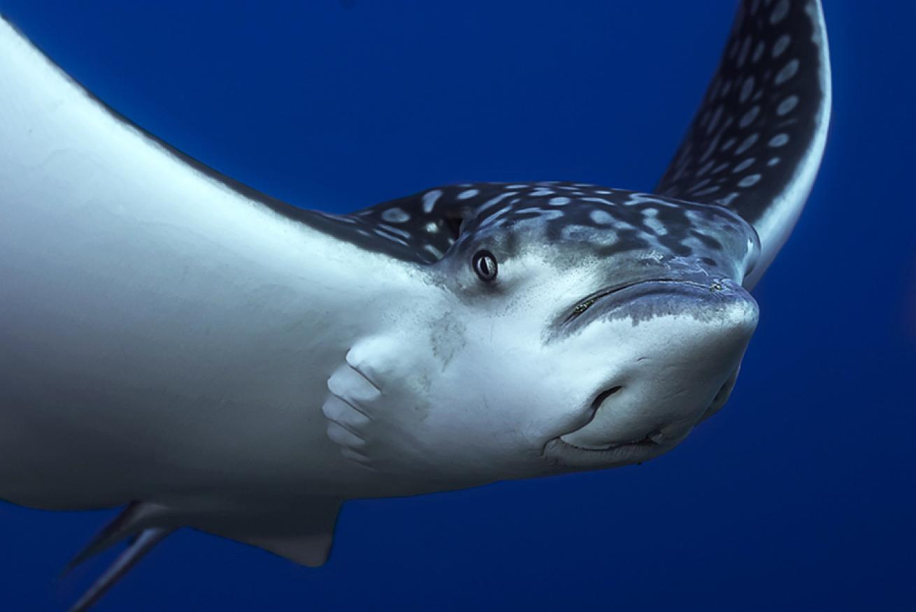 A close-up encounter with a spotted eagle ray (Aetobatus narinari). They are smaller than their manta ray cousins, growing to an average wing span of around 9 feet. Their snouts are rounded and pointed at the tip, hence resembling a bird’s beak.