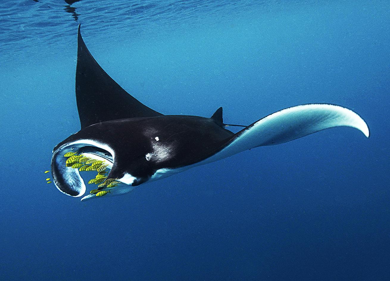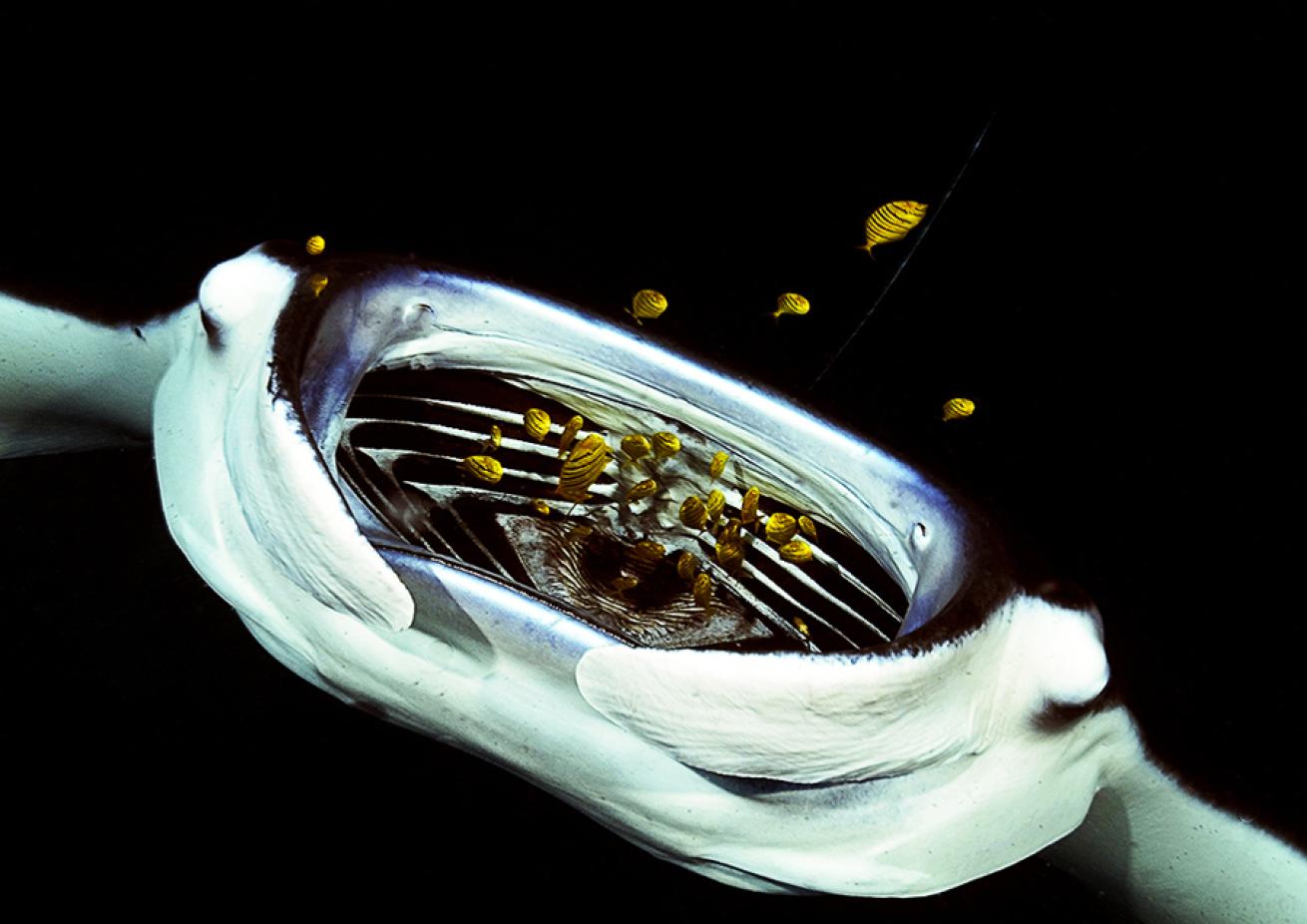 A giant manta with gold trevallies lining its gaping mouth while feeding.
