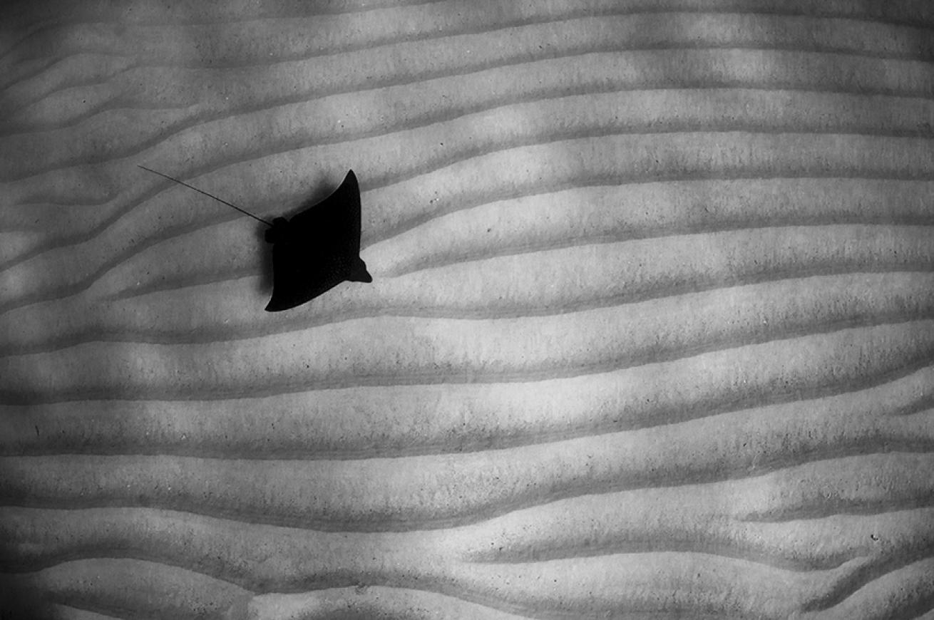 An eagle ray swims over perfect sand ripples resembling a manicured zen garden. Well adapted with its shovel-shaped snout and electroreception ability to detect, the eagle ray is ideal for hunting in the mud and sand for benthic invertebrates.