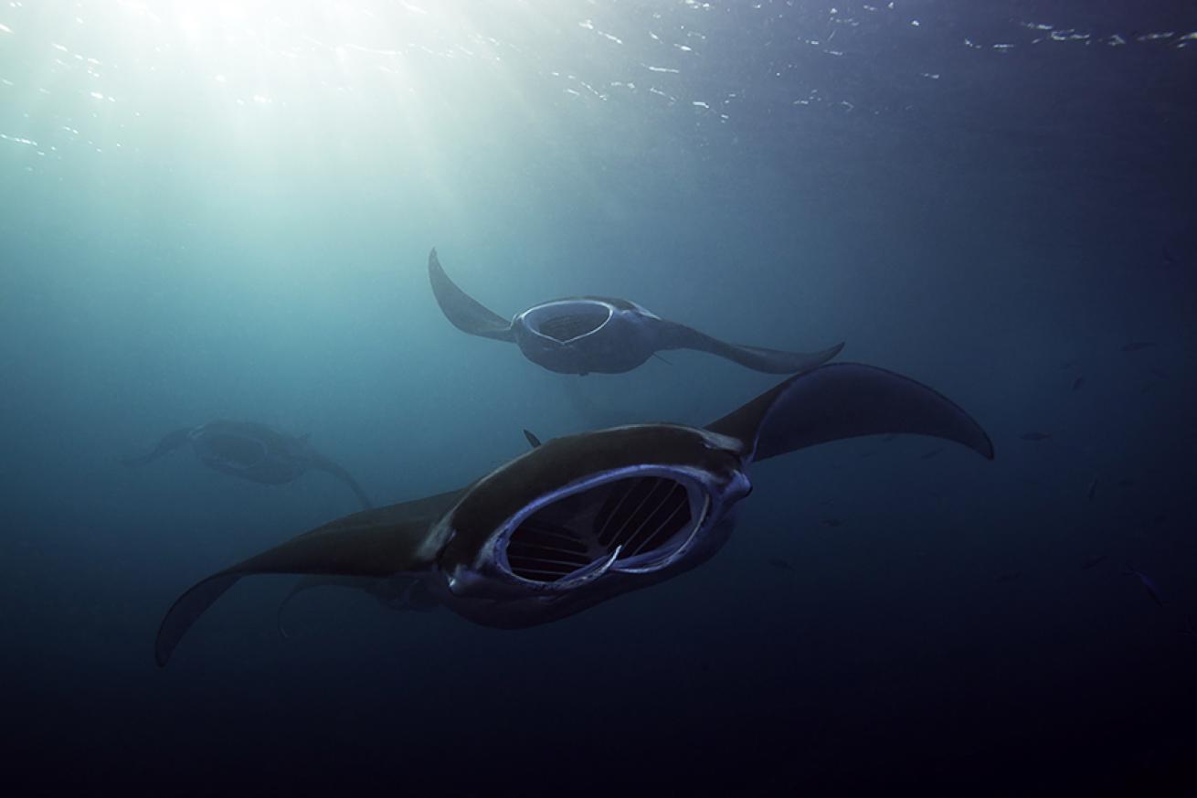 3 Manta Rays feeding on Plankton during in the late afternoon. Mantas are gentle, fast and highly intelligent.