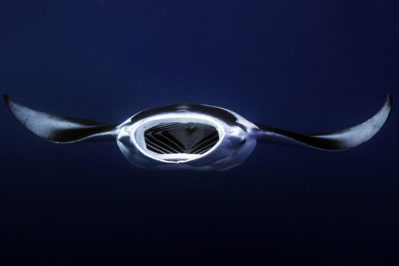 Giant manta rays are primarily plankton feeders. They feed by using the unfurled cephalic fins on the head to funnel plankton-rich water into the mouth where gill rakers filter out the plankton. As they feed, mantas often display their graceful acrobatic skill to optimize their plankton-rich water intake.