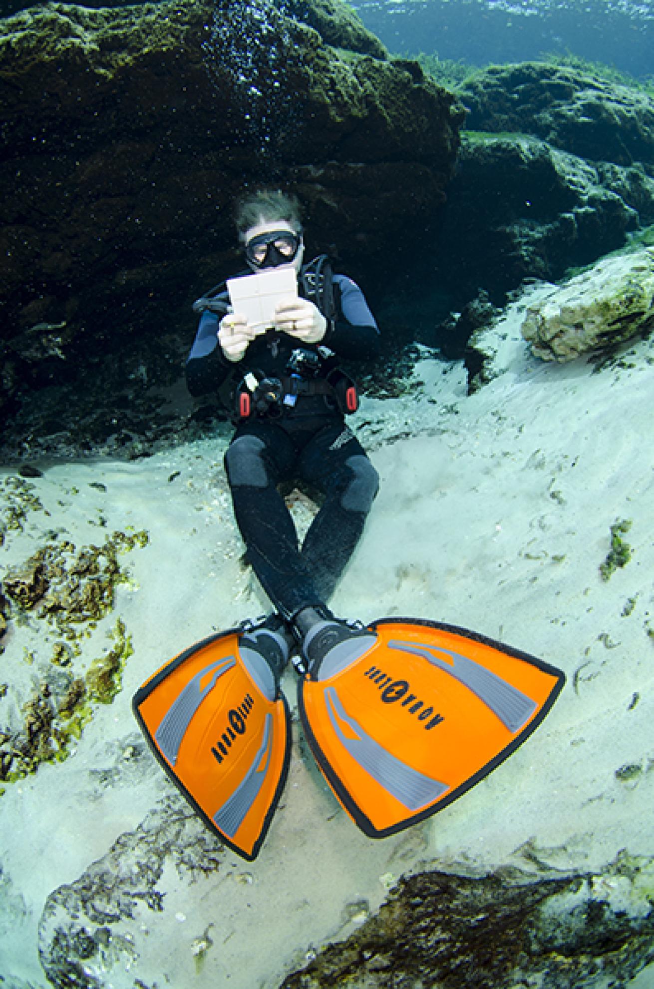 Elly WrayScubaLab team recorded results of the fin test on waterproof paper while underwater.