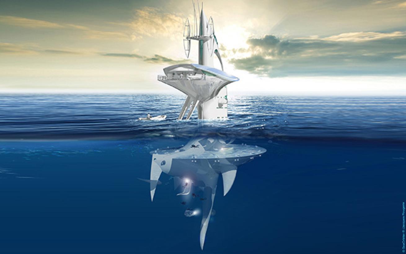 Jaques Rougerie's high-tech floating laboratory will tower nearly 90 feet above the surface and 100 feet below.