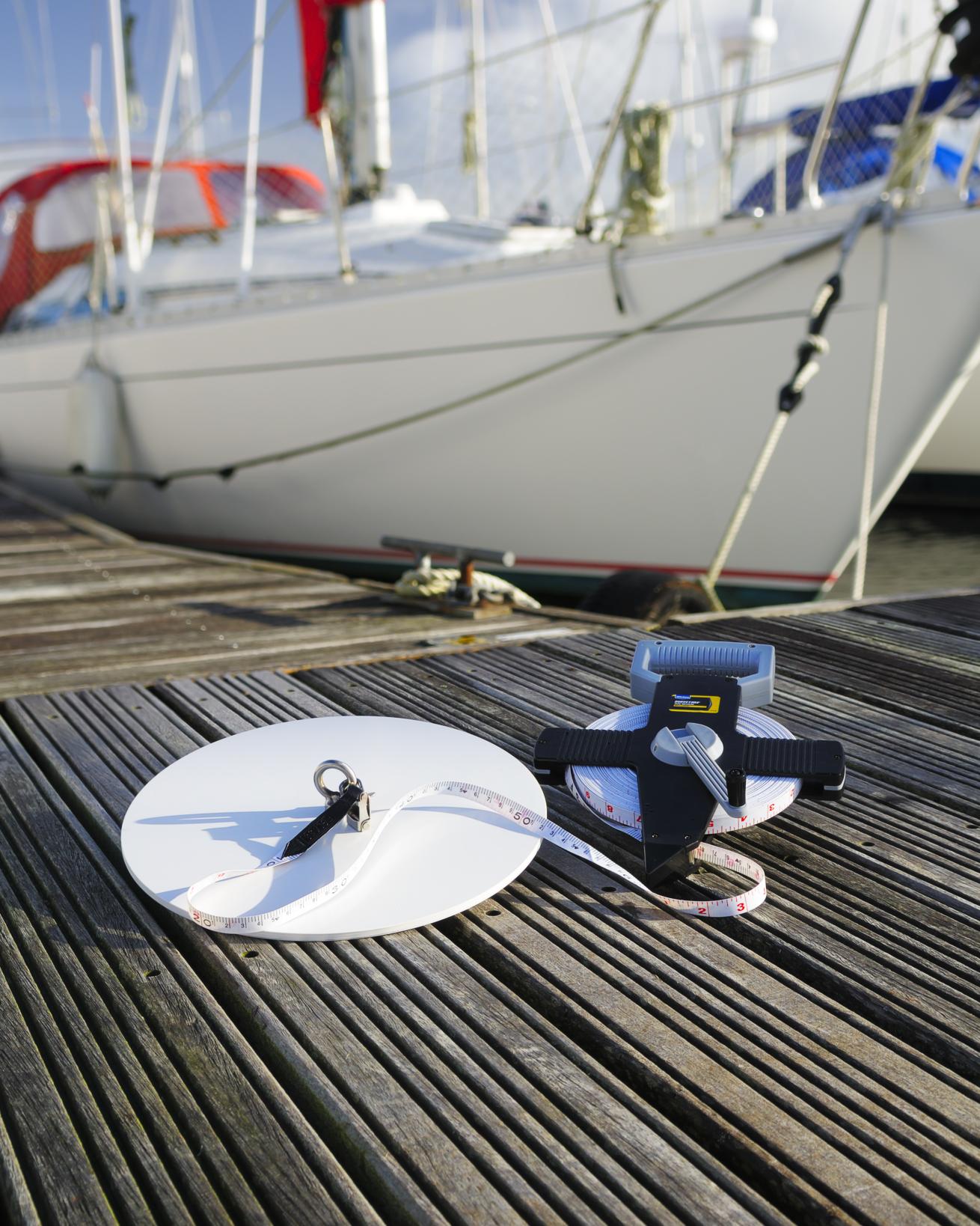 Attached to a measuring tape, the Secchi Disk is lowered over the side of a boat and the depth at which it disappears from sight estimates the amount of phytoplankton in the sea. This depth can then be uploaded to a database using the Secchi app.