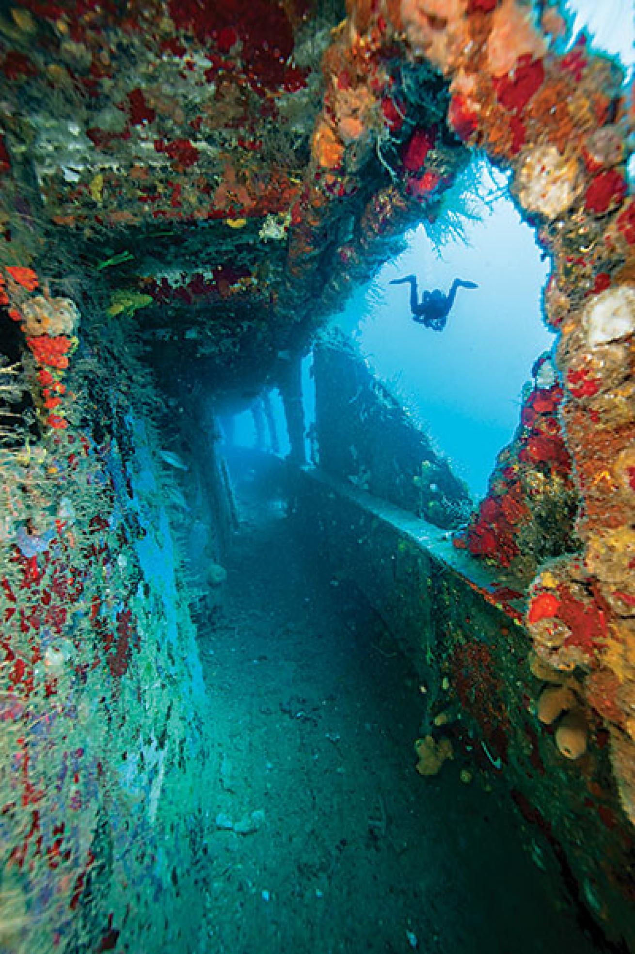 The nearly 250-foot steel freighter was sunk as an artificial reef in 1999; today it remains intact and upright, with a profusion of fish and corals. Nearing the sandy bottom, we fare out with our arms forward and glide into the ship’s superstructure with methodical frog kicks, exploring deep beneath the deck of the cargo holds, along the exterior walkways, and through the wheelhouse.