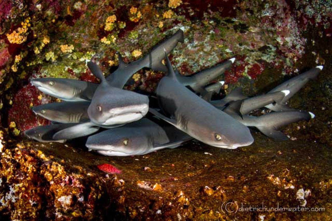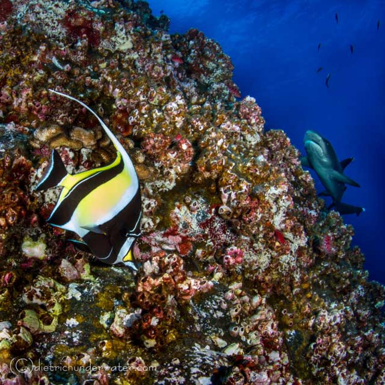 A Moorish idol graces the foreground with a whitetip shark for company.