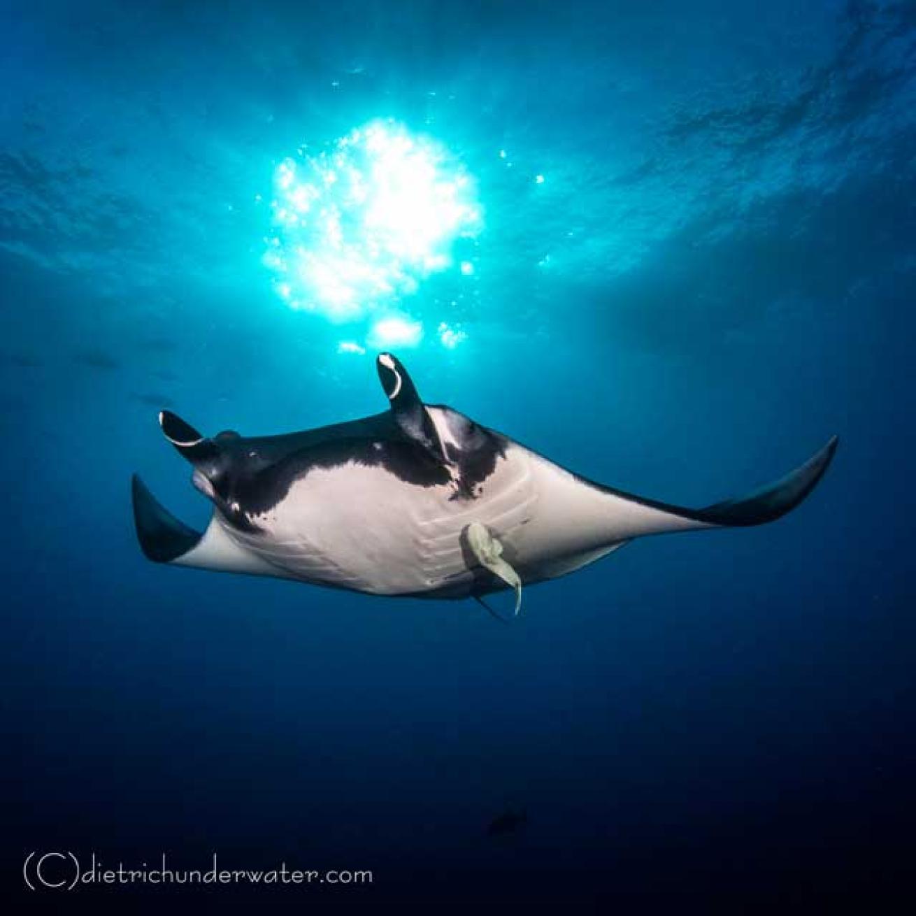 A giant pacific Manta Ray swims gracefully through the sun's rays.