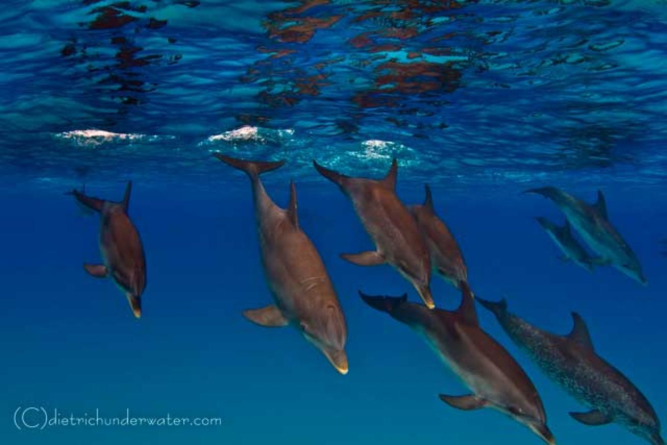 A mixed pod of Atlantic Spotted and Bottlenose dolphins break the surface.