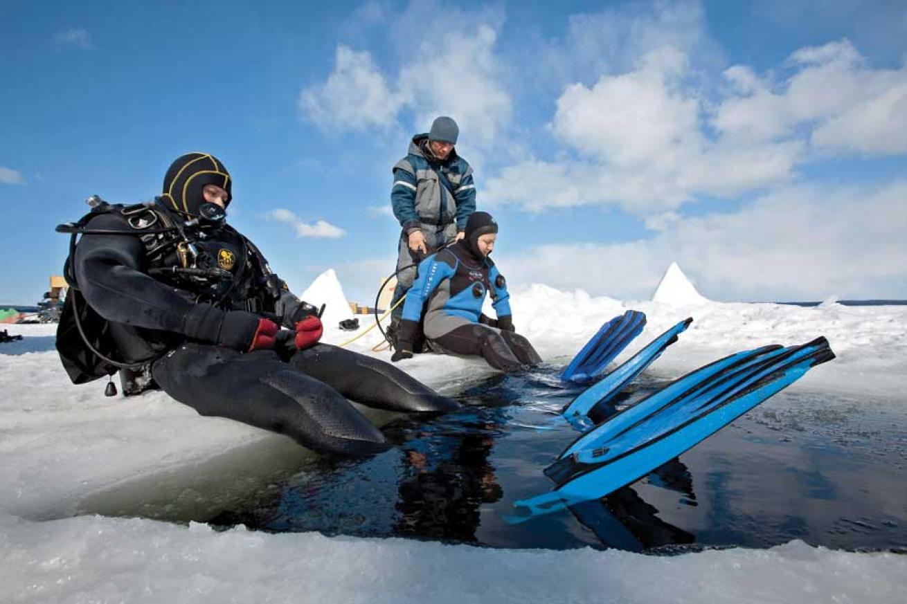 Franco BanfiDivers prepare to enter Russia's White Sea through mainas, or holes in the ice.