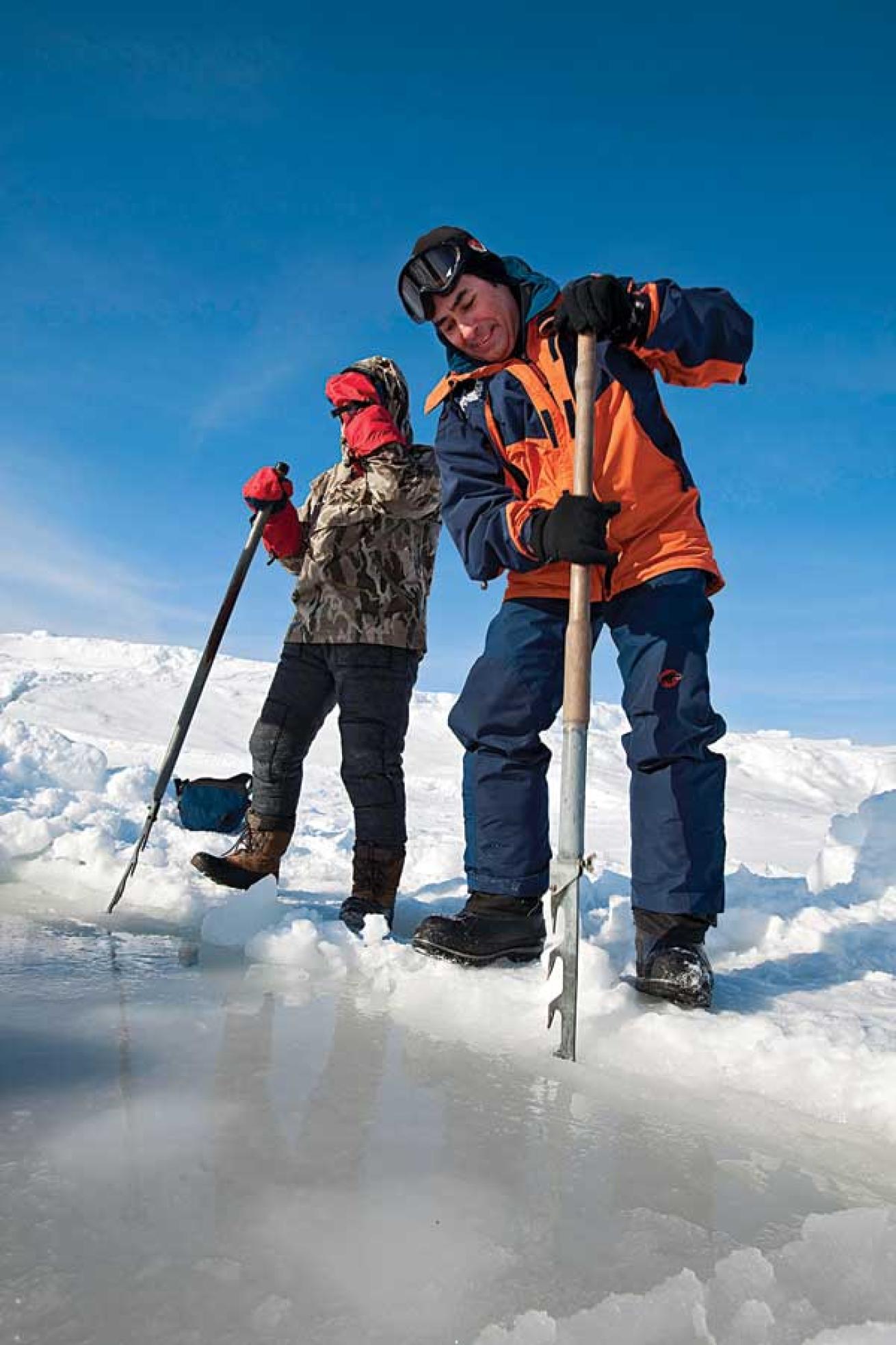 Reaching the underwater world at last is an experience itself. At the beginning of the ice-diving season — from late February to mid April — well-defined mainas, or ice holes, are cut into the ice platform. Due to the low temperatures, they must be dug again for every dive because marine water rises through the holes, forms puddles and quickly freezes. In just one night, a thick layer of ice bars these passages; every day tenders must hack through again with large handsaws.