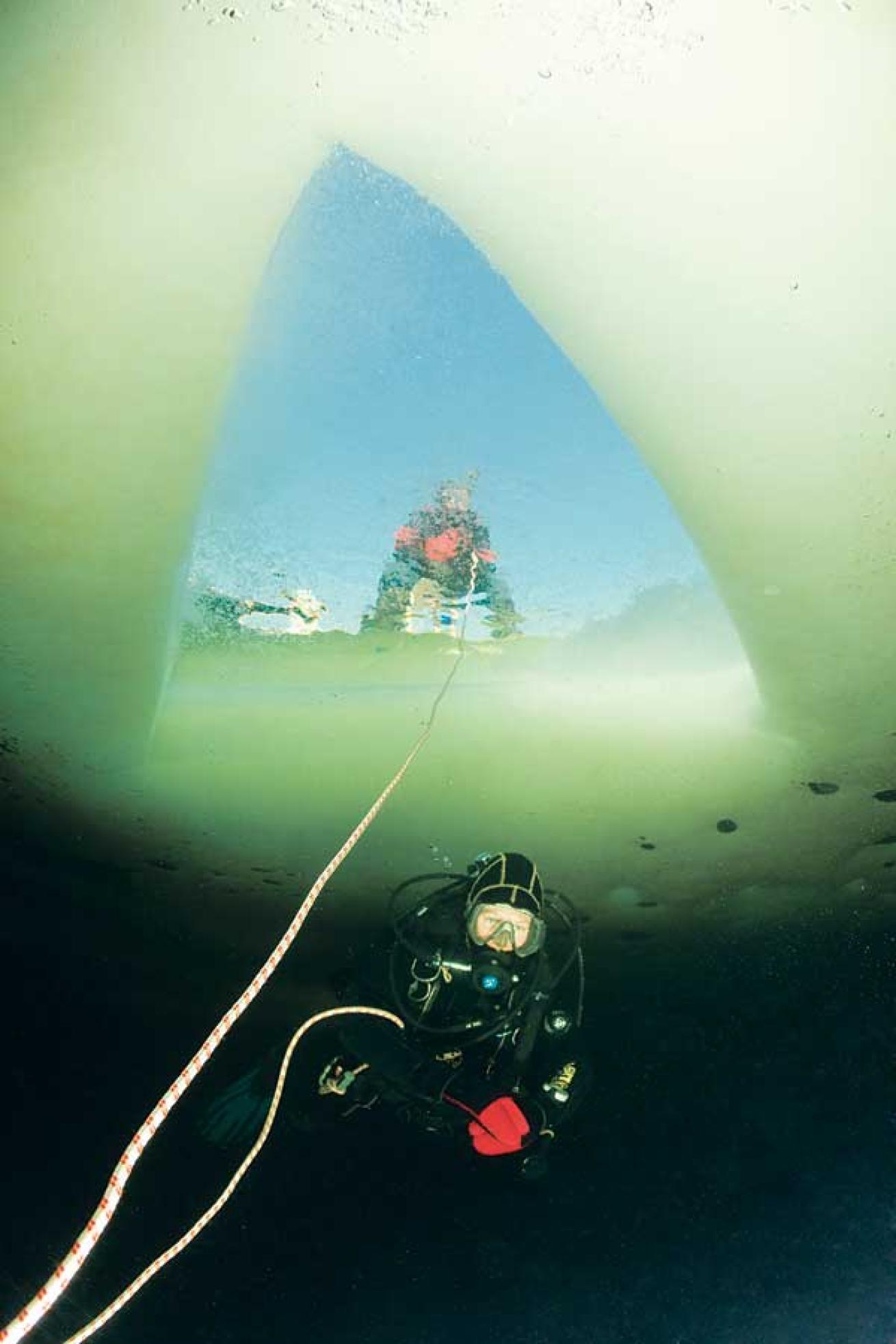 Constant contact will be maintained with the surface via a line held by the “tenders” — by far the most important guys in the whole operation. If the diving seems challenging, think with pity of the men who must withstand air temperatures some 20 degrees below that of the dive environment, and who share responsibility for diver safety no matter what foolish thing a diver might decide to do under the ice.