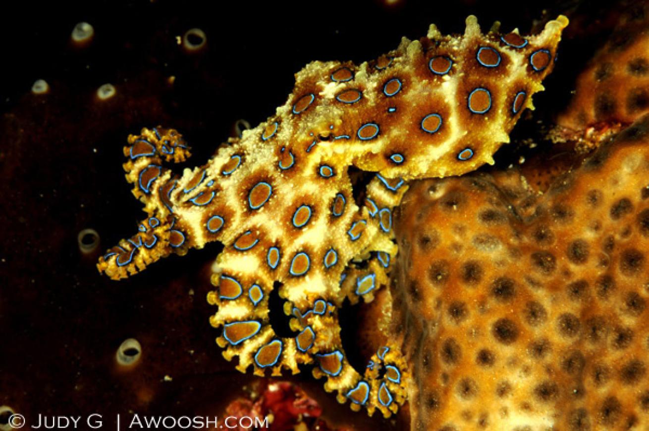 This little beauty is one of the most toxic creatures in the ocean, with venom that is reported to be 1,200 times more toxic than cyanide. The venom is delivered via a bite from the animal’s beak. These octopuses are quite small — about 2.5 inches long. This octopus, like its cousins, is able to camouflage itself quite well on the reef. When agitated or excited it flashes its iridescent blue rings, from which it gets its name. This octopus was photographed in the Banda Sea, in Indonesia. They are fairly common in the tropical south Pacific ocean.