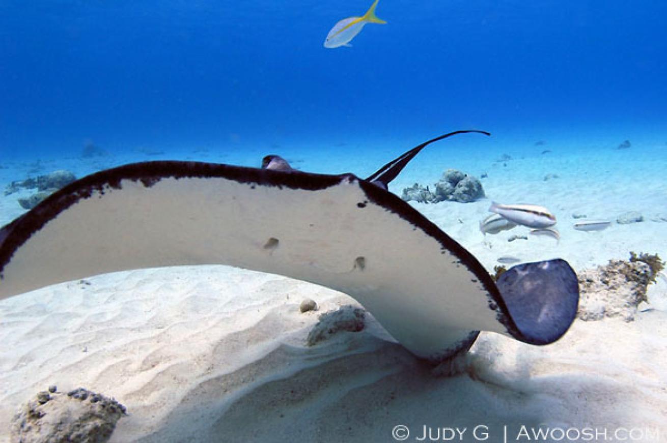 The stingray is a very common reef creature and can be seen in many locations around the planet. Stingrays got a bad rap when Steve Irwin was tragically killed by a tail strike through his heart while diving with them in Australia, but generally, these are quite benign, bottom-dwelling creatures that would rather fly away than fight. Steve Irwin’s mistake was coming up above and behind the creature that killed him — the same approach that would be made by their primary predator — sharks. The tail barb is venomous and can deliver a nasty sting. The people most at risk for being spiked by a stingray are those walking across sandy bottoms. Divers and photographers should approach from the stingray's front or sides.