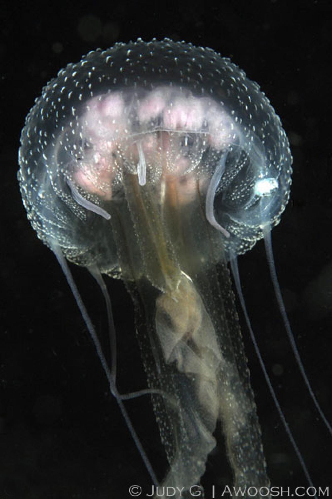 Jellies appear in oceans around the world, and in a few land-locked lakes in Asia. Almost all jellies pack a painful sting, which is delivered on contact via nematocysts on their tentacles. Some jellies are quite compact (for example the moon jelly), while others have tentacles that trail several feet behind the animal. And a very tiny, almost invisible to the eye jelly, the dreaded Irukandii, which is common off the northeast coast of Australia, is extremely toxic and sometimes fatal. Box jellies are also very dangerous. Other jellies can inflict a painful sting, but are not usually fatal. Care should be taken when approaching jellies to have a closer look or photograph them, as their trailing tentacles are so slim and translucent that they can be difficult to see.