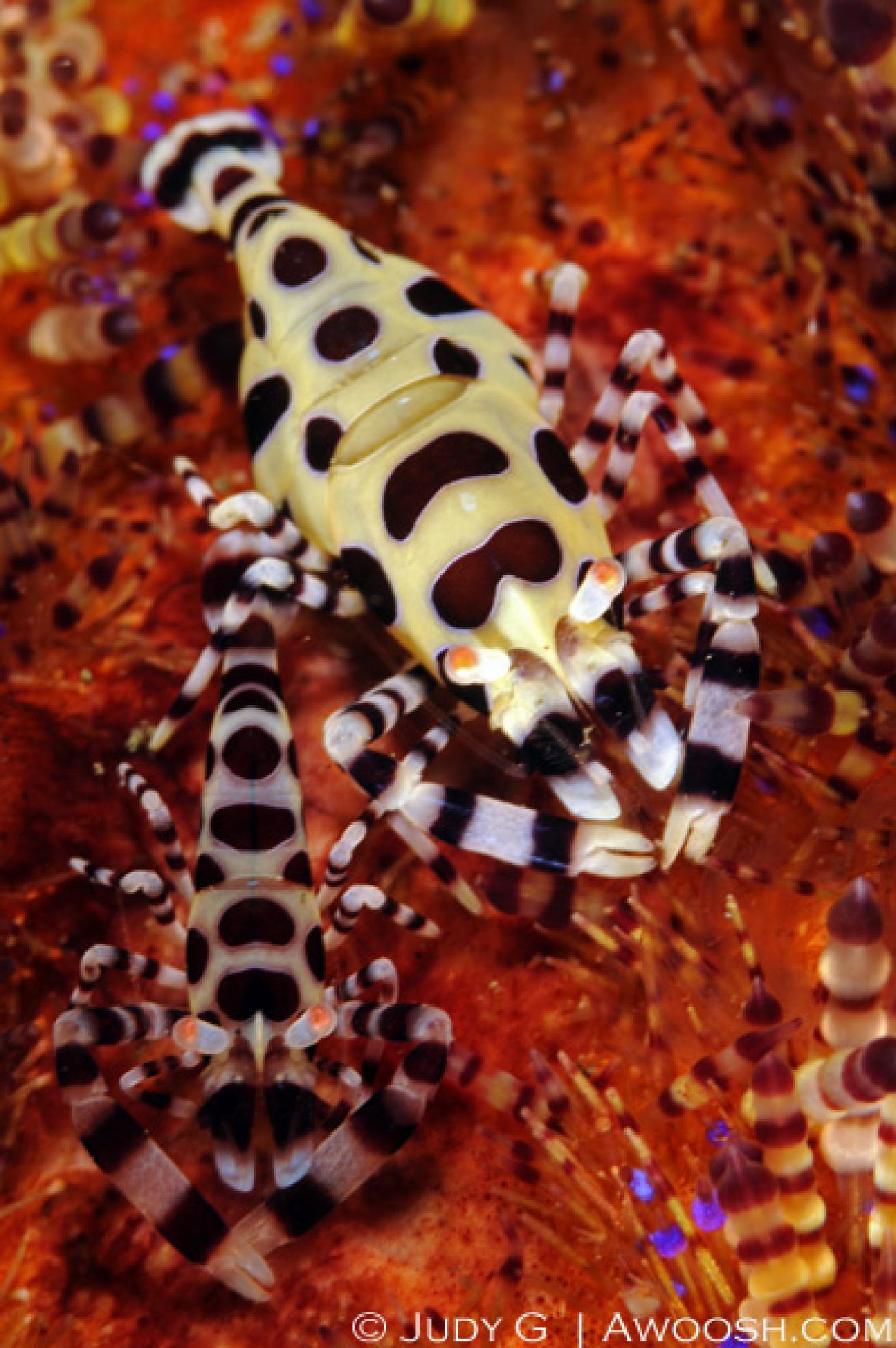 These beautiful, wildly colorful and quite large urchins are found in Asia. Photographers in the know like to have a close look at these urchins, searching for Coleman Shrimp (like those in this picture), squat lobsters, and a few other small creatures that like to make their homes on the surface of these venomous creatures. These Coleman shrimp are about half an inch long, meaning that a photographer or observer will have to get very close to the urchin to see them. The shrimp (the female is the larger of the two) have clear-cut a small site on the urchin, and live there. The urchin's spines are covered with toxins, and can break off and embed themselves in flesh. Contact will be extremely painful, so great care should be taken.