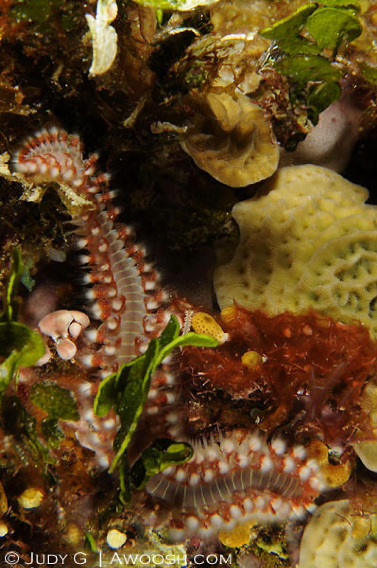 There are several varieties of fire worms found in the Caribbean and the Indo Pacific. These caterpillar-like creatures are also found in the Mediterranean Sea, and likely in many other tropical and sub-tropical ocean settings as well. They grow to be about six inches long. As their name suggests, fire worms are painful to touch. Their bristles are coated in venom, and like sea urchins, the tips may break off when contacting skin and embed themselves, requiring treatment. I captured this image of a bearded fire worm in Cozumel.