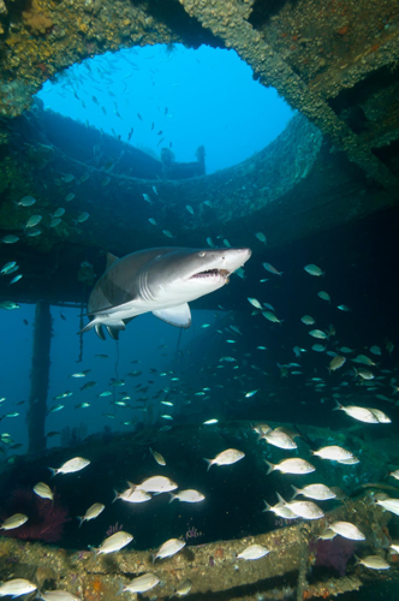During the early stages of WWII, German U-boats wreaked havoc along the Eastern seaboard sinking numerous Allied merchant ships. In the confusion, the wreck of the W.E. Hutton was misidentified by the United States Navy and thought to be the wreck of the Papoose. Even though this mystery has been solved, most scuba divers still refer to the ‘Hutton’ as the Papoose. Here, a sand tiger shark lurks inside the shipwreck off the coast of North Carolina.