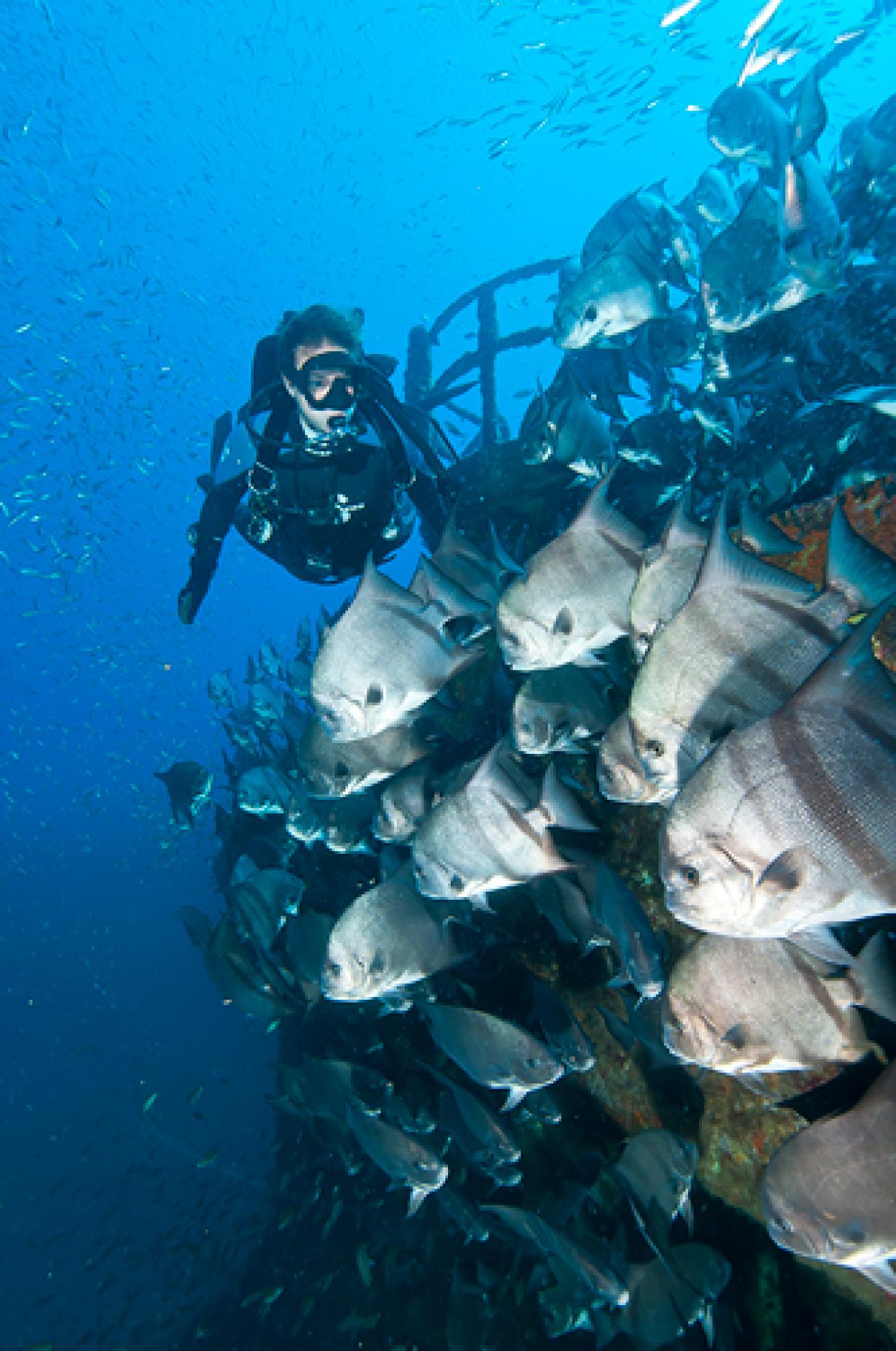The Spar offers wreck-loving scuba divers lots of external features to explore, including a crane, an intact propeller and rudder and more. The prolific marine life that populates the wreck, like this school of Atlantic spadefish, share the attraction.
