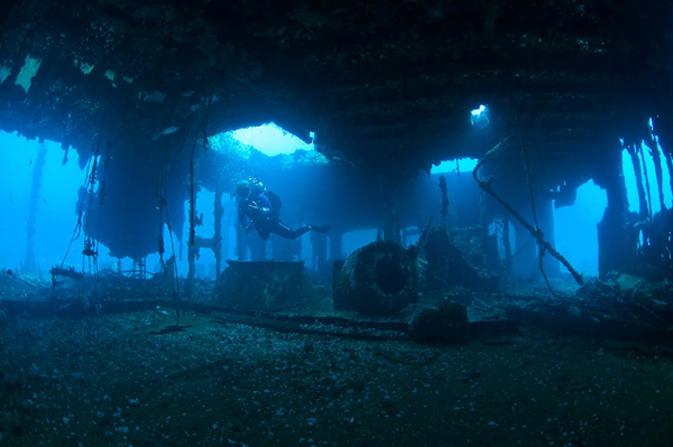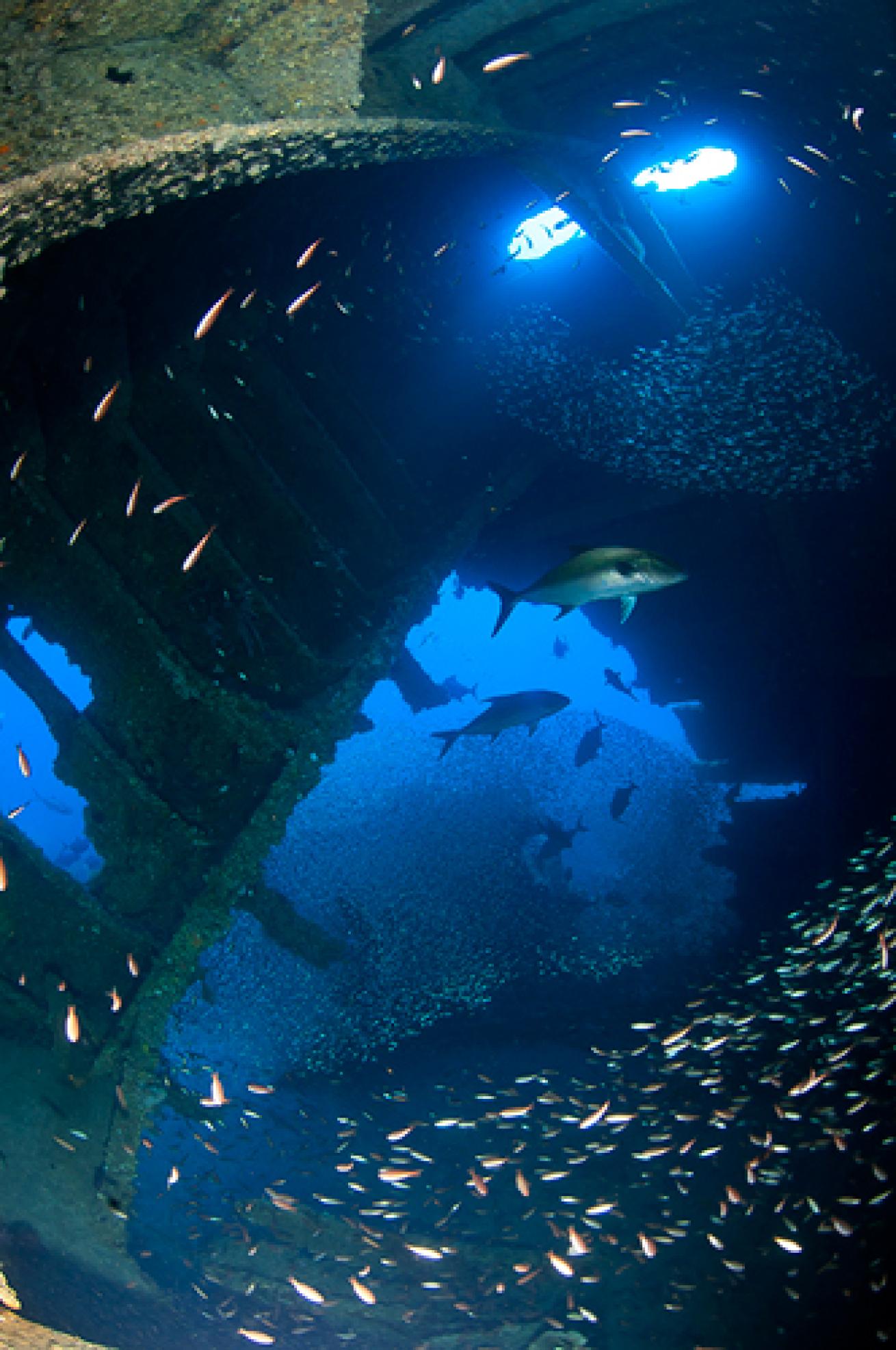 The wreck of the Papoose has a convoluted history since in actuality it is the wreck W.E. Hutton. Sitting upside down in 120 feet of water, the 435-foot tanker attracts a plethora of marine life that includes the sand tiger sharks that are seen here with regularity. And because it rests nearly 36 nautical miles from shore in the clear waters of the Gulf Stream, 100 foot of visibility is not unheard of. This interior view of the wreck shows why it's a favorite of scuba diver visiting the North Carolina coast