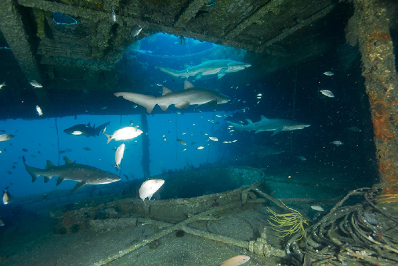 5 — Caribsea One of my personal favorites, the wreck of the Caribsea is one of those hit and miss dive sites. Notorious for low visibility conditions as well as large schools of sand tiger sharks, this dive can be a top shelf experience when the blue water pushes in on rare days, exposing up to 100 sand tiger sharks in one spot. Sunk on March 11, 1942, by a German U-boat attack, this 251-foot freighter sits in 90 feet of water on the east side of Cape Lookout Shoals. Scientists believe the sand tiger sharks gather here during the summer months to mate.