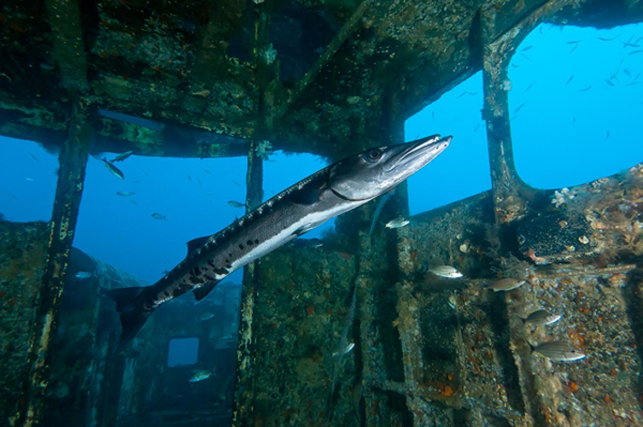 Amazingly, the Spar was moved 200 feet from her original location and rolled over on her port side when Hurricane Irene struck the coast in August 2011. She weathered the storm intact, though — a tough little ship. Barracuda, shown here, are frequenly seen by scuba divers venturing into the wheelhouse of this popular North Carolina shipwreck.