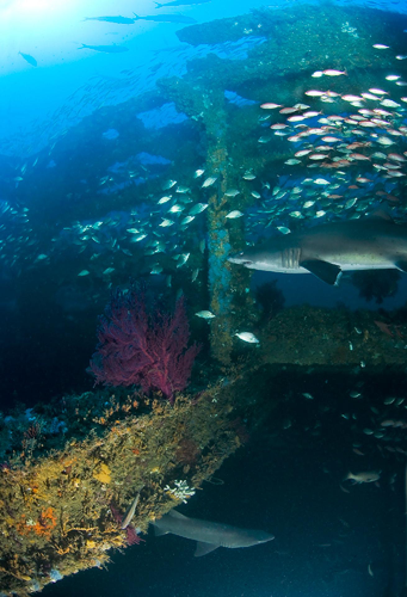 8— Atlas Another victim of a German U-boat attack, the 430-foot Atlas tanker was sunk on April 9, 1942, only a few miles from the wreck of the Caribsea in 115 feet of water. Like the Caribsea, the visibility on the Atlas can sometimes be less than 20 feet, but when the blue water rolls in this wreck site is a showstopper. Enormous sand tiger sharks at a whopping 10 feet in length can be seen patrolling the wreck by the dozen. The marine life is thick on this wreck and an opportunity to dive it should not be missed.