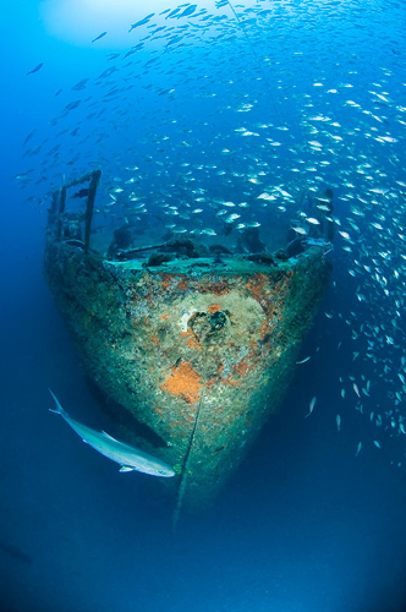 Not all the wrecks of North Carolina met their end due to tragic events. The USCG Cutter Spar is one of the many ships sent to the bottom as part of the North Carolina artificial reef project. The 180-foot buoy tender sits in 110 feet of water with a strong list to port. It has become very popular with scuba divers because it’s fully intact, easily navigable and a favorite hangout for sand tiger sharks, schools of Atlantic spadefish, the occasional giant southern stingray and greater amberjacks, shown here cruising the bow.