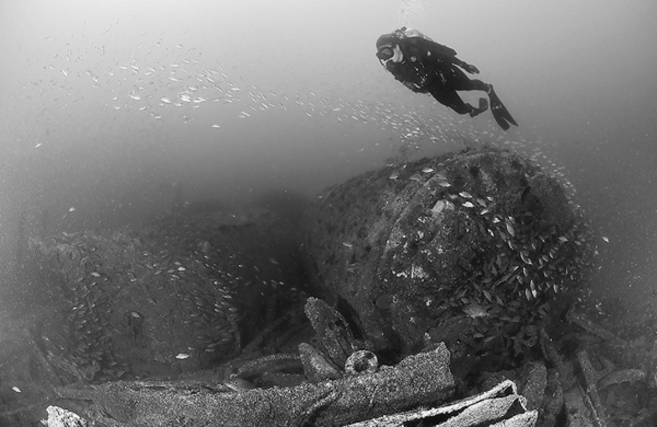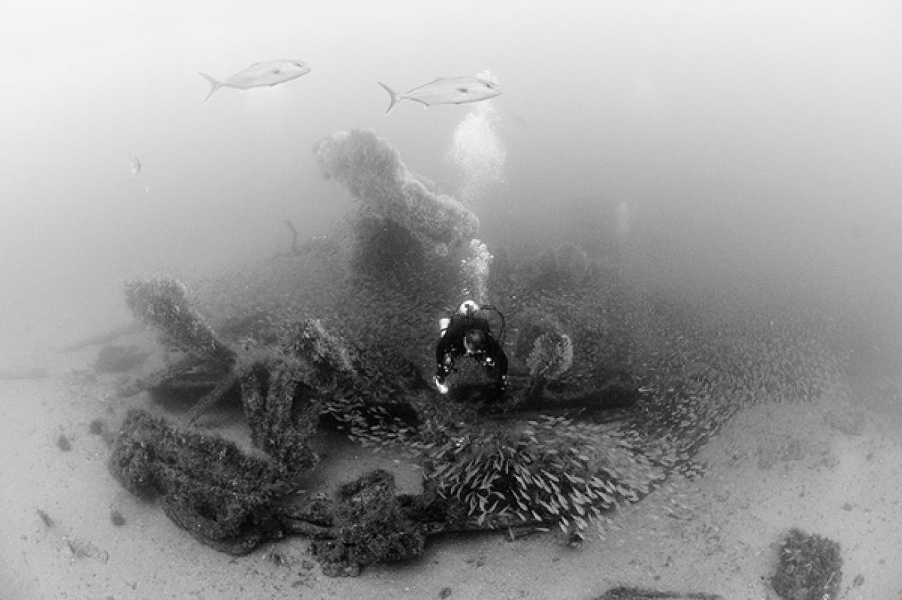 The captured World War I German gunship, the USS Schurz, is a classic North Carolina wreck dive. The 255-foot ship, sunk in 1918, was a a popular dive for those seeking to reclaim artifacts and take home a small piece of history, including brass portholes, crew personal effects and weapons. Today, it is illegal to take artifacts from the shipwreck, and most scuba divers are content to see the beautiful reef system with colorful sea fans, abundant marine life, dense schools of baitfish and the occasional shark. Here a diver investigates the boilers that remain.