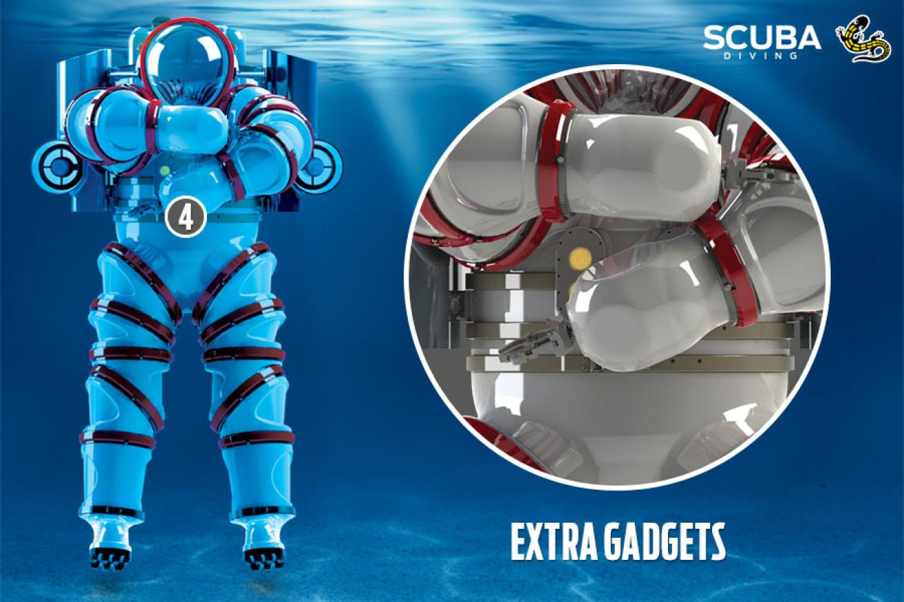 The suit's hands have one “V” jaw to grab bulky items, and a “parallel jaw” is for delicate artifacts. It’s also equipped with a Spyderco knife and hook, and a five-pronged "pretender" (not pictured) that mimics a human hand. Other features include Imagenex 852 sonar and two 9,600-lumen Newtsun lights.