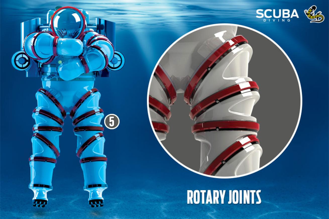 The Exosuit has 18 rotary joints. The wrist joints, which are 6 inches in diameter, are capable of rotating 360 degrees, and the design allows the pilot to move his body relatively freely.
