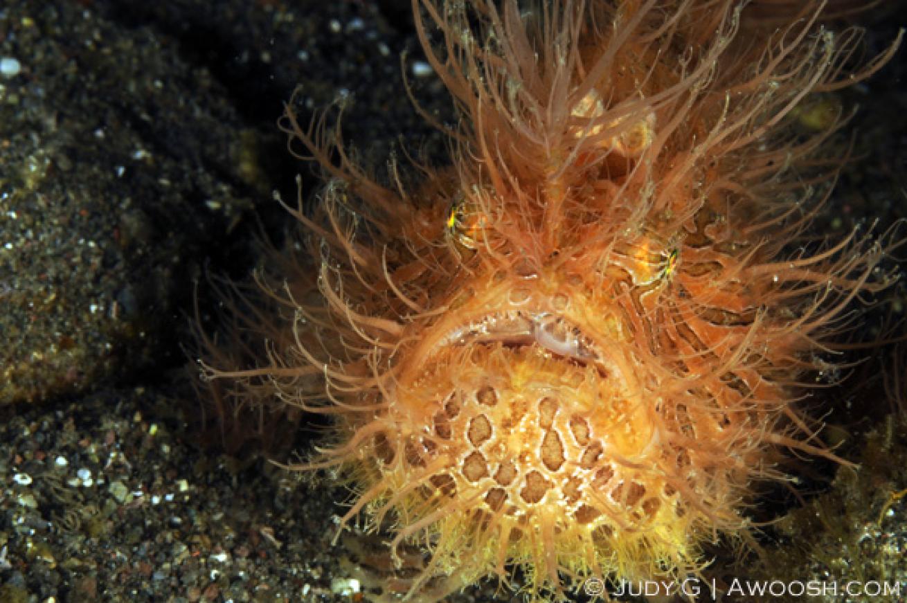 It doesn’t get much weirder than this! There are many species of frogfish in Indonesia, including Giant Frogfish in a variety of colors (including the impossible-to-photograph black version), but this little hairy customer is something else. This image was captured on a night dive in southern Komodo. It was about 5 inches in length.
